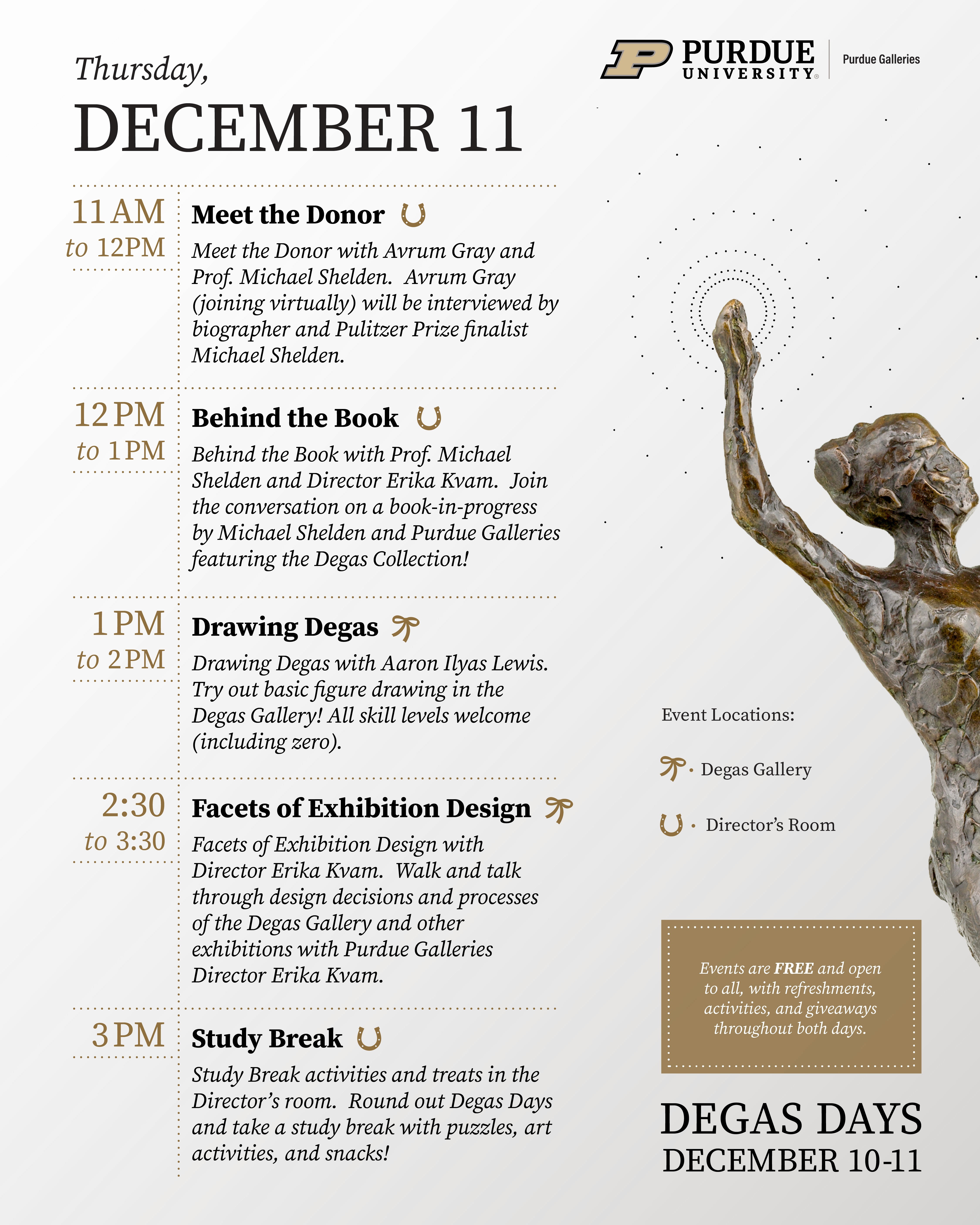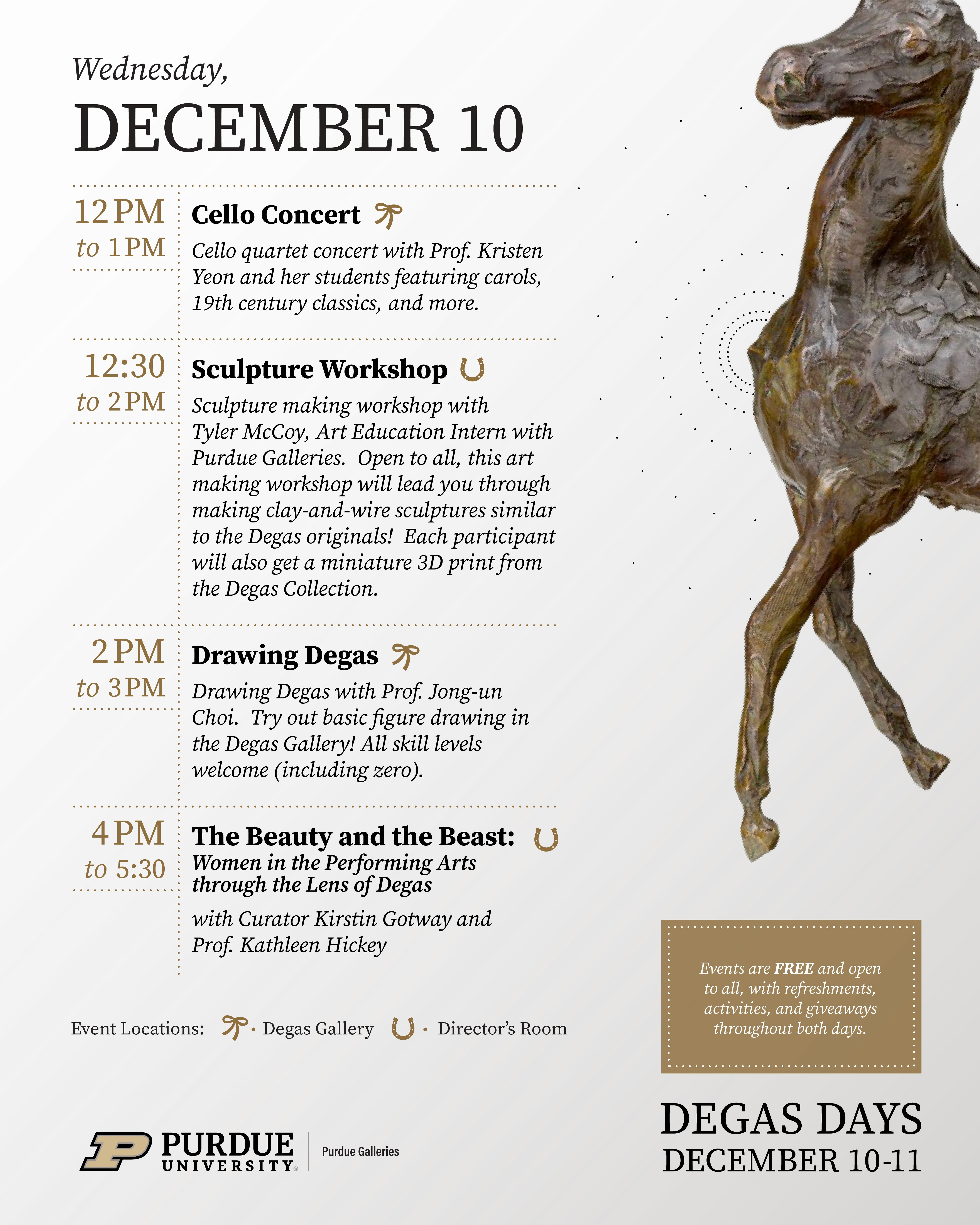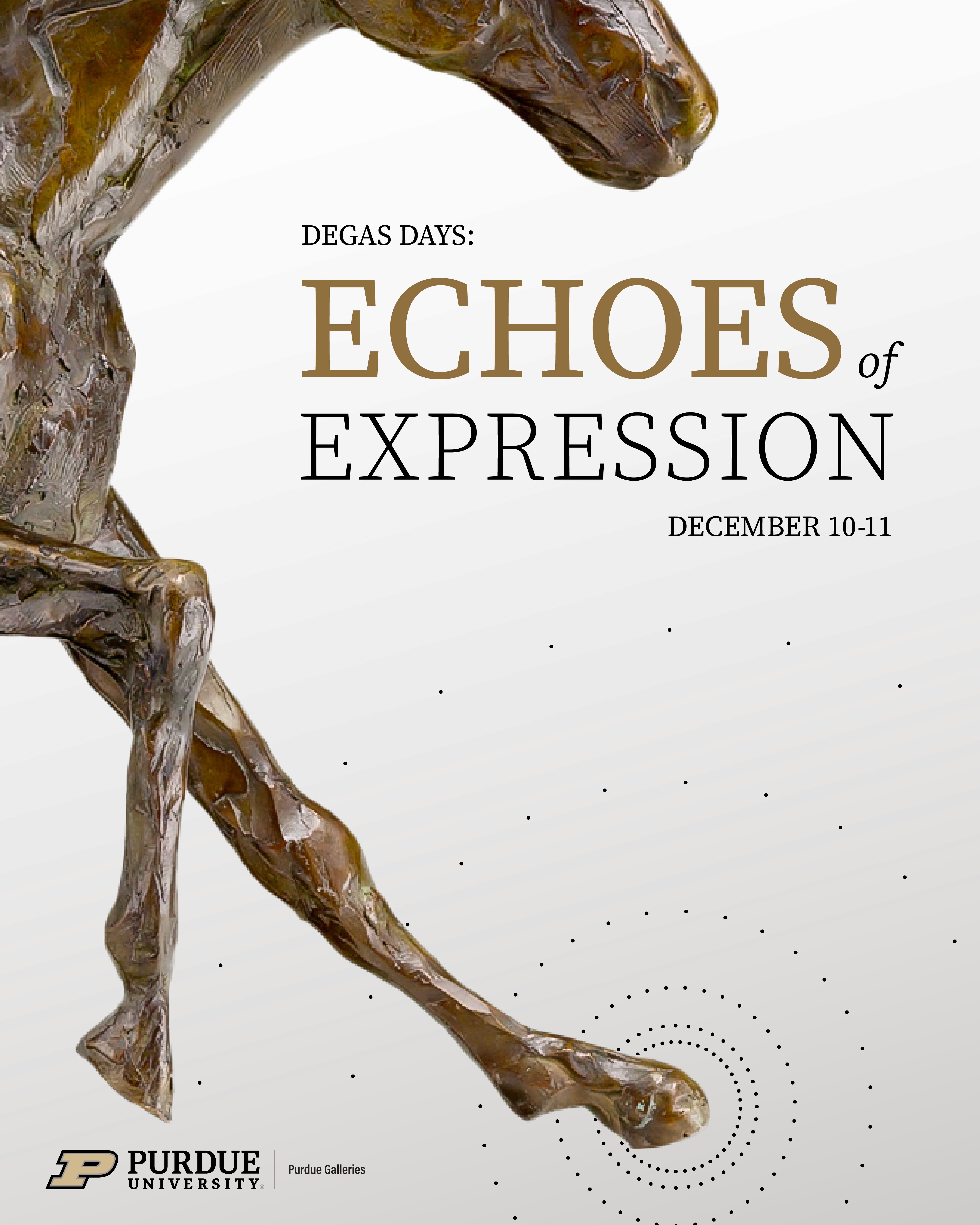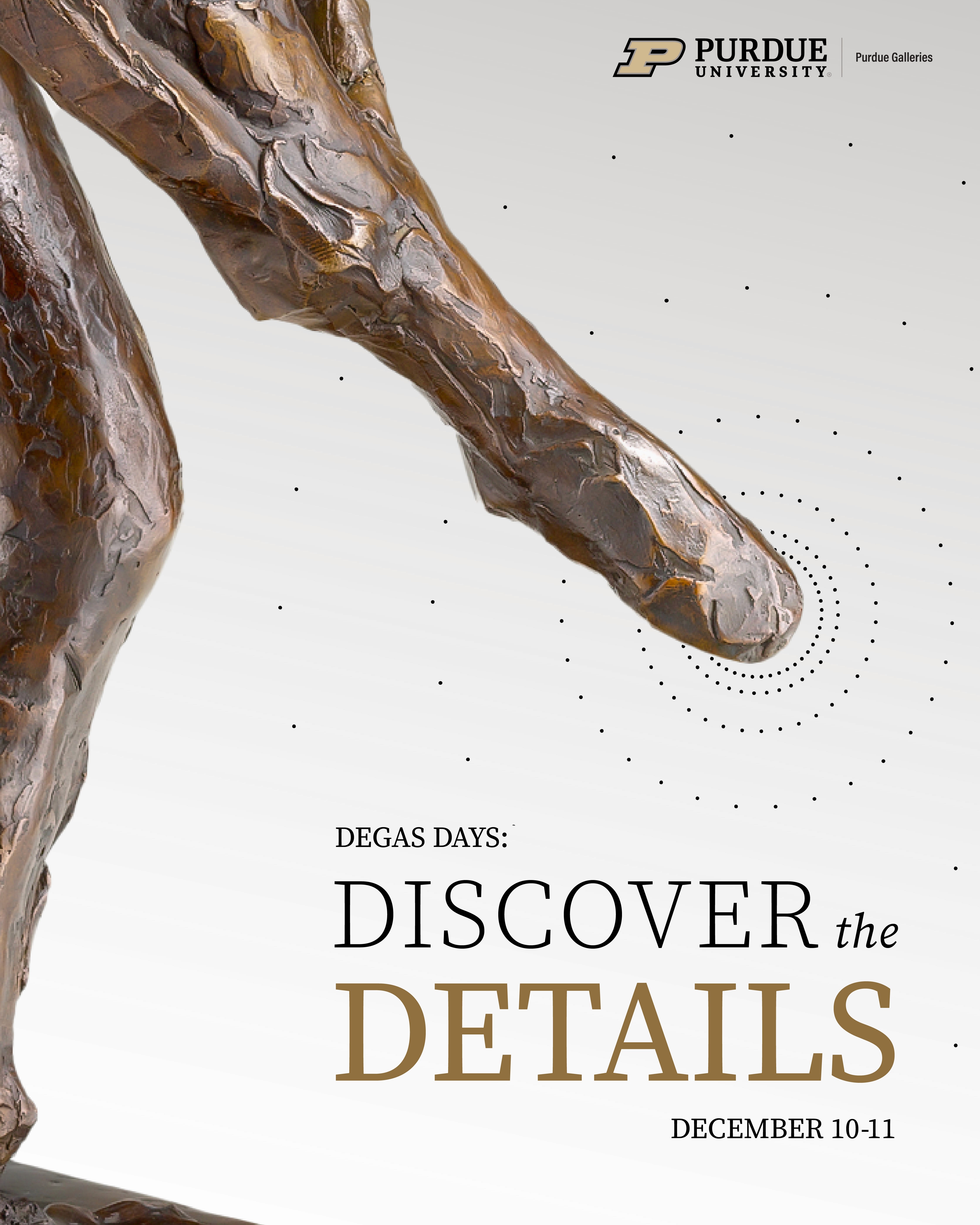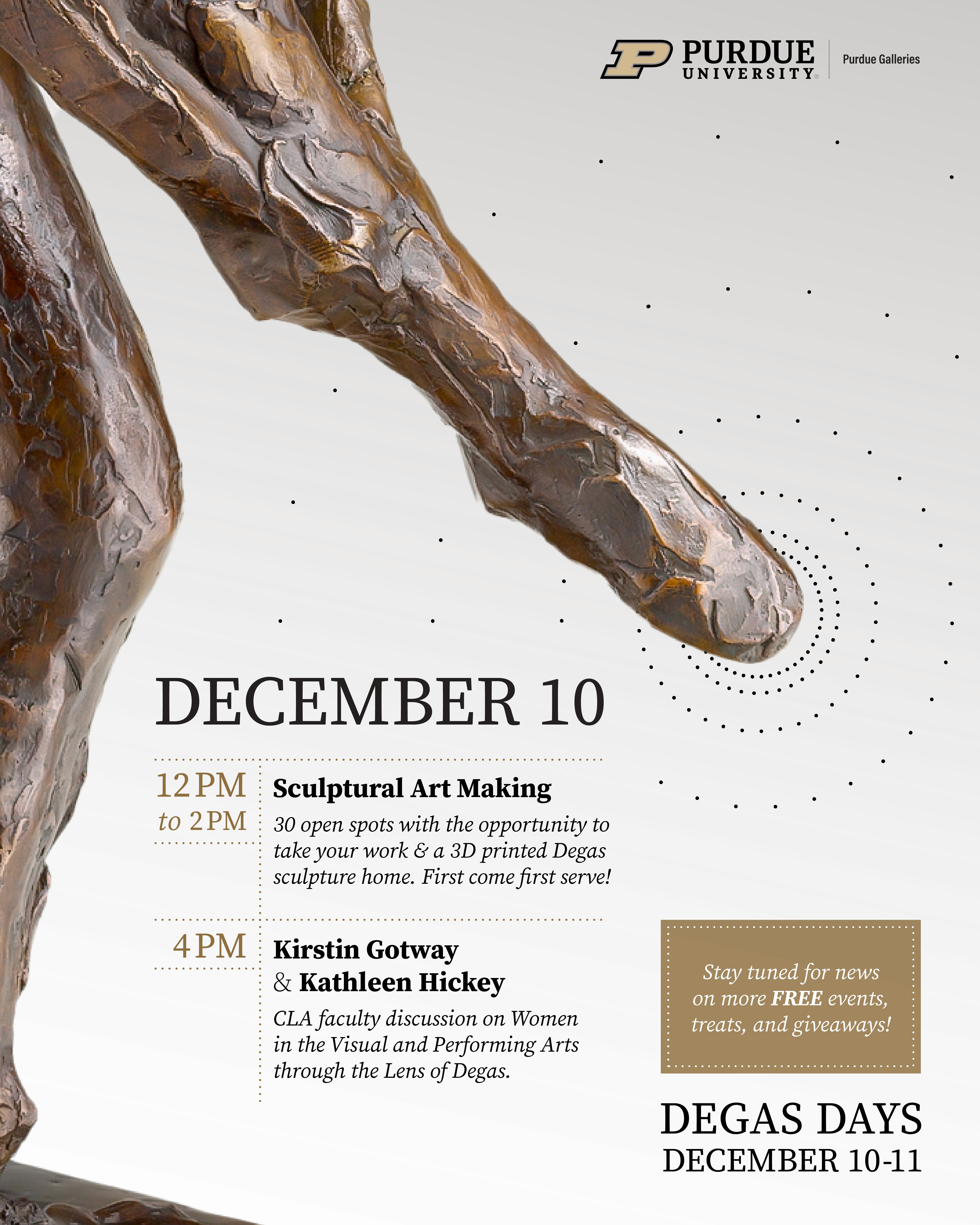 In December 2025, Purdue Galleries hosted a two-day event called "Degas Days," celebrating their Degas Collection with various activities throughout both days. I had the privilege of designing the visual identity for the event and all marketing assets associated with it. Using high-quality images of the bronze statues featured in the Degas Gallery, I framed the design identity around the beauty of the details of these works. My final deliverables included a few social teasers, digital schedule posters for each day, and printed poster displaying the whole schedule.