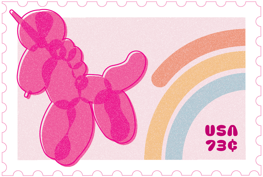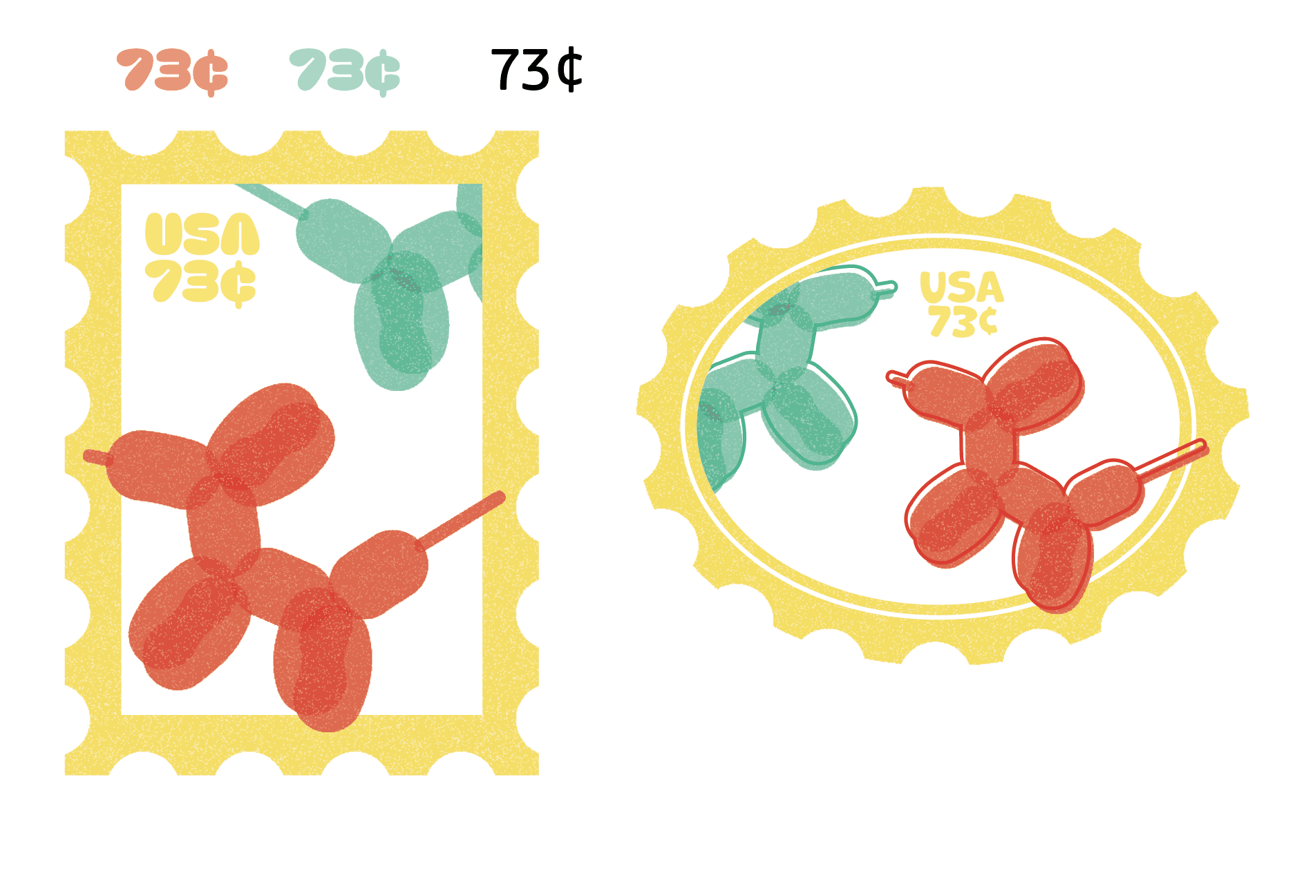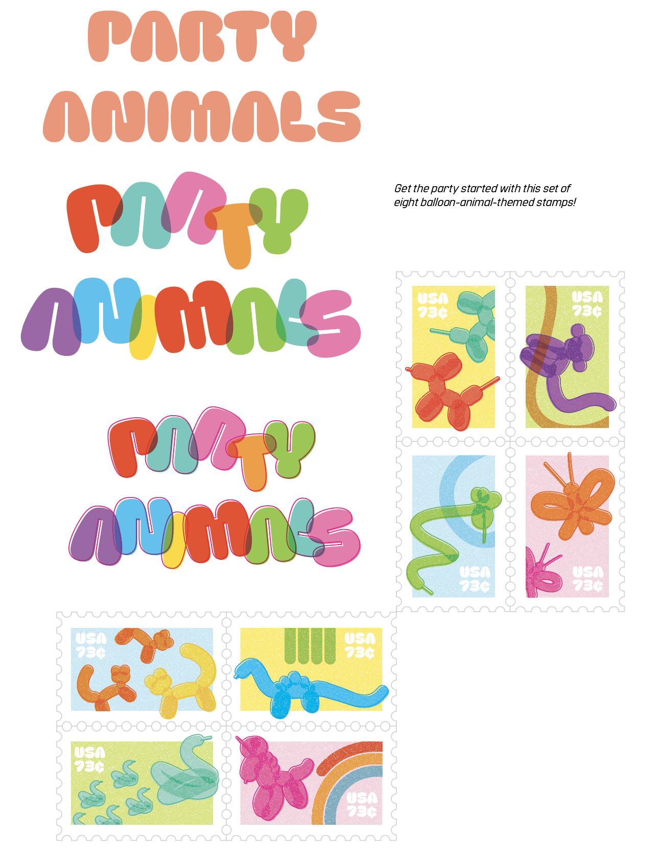 The task for this assignment was to design a set of stamps based on a particular theme. I chose to focus my stamps around the theme of balloon animals, and ideated different possible balloon animals to include on the stamps. My process began with illustrating each animal in illustrator, and adding backgrounds and textures to each illustration. The process was completed by designing a stamp sheet and giving the collection a title: Party Animals.