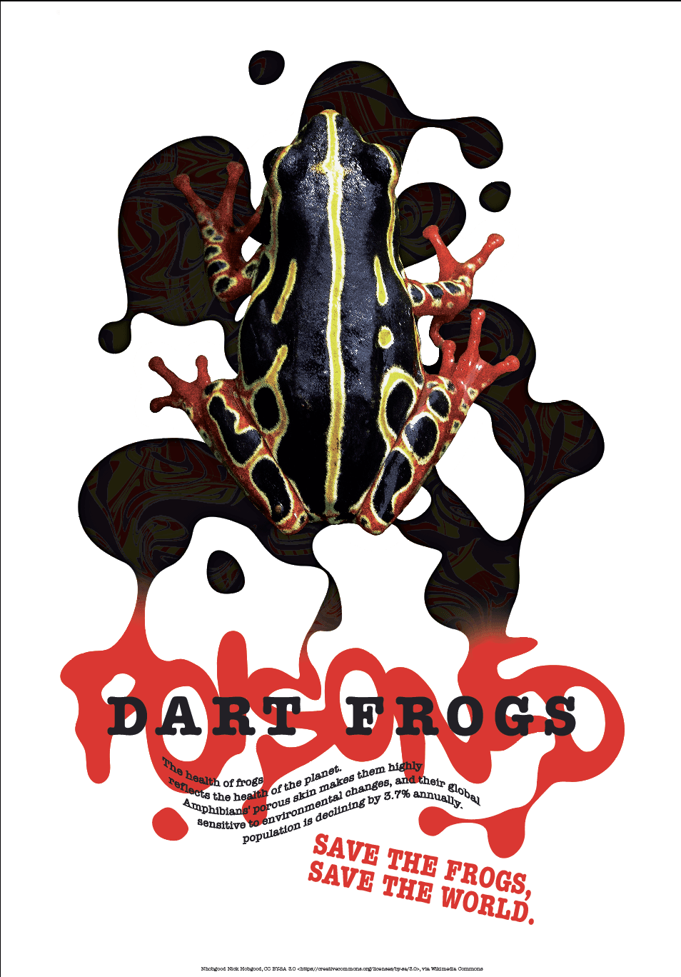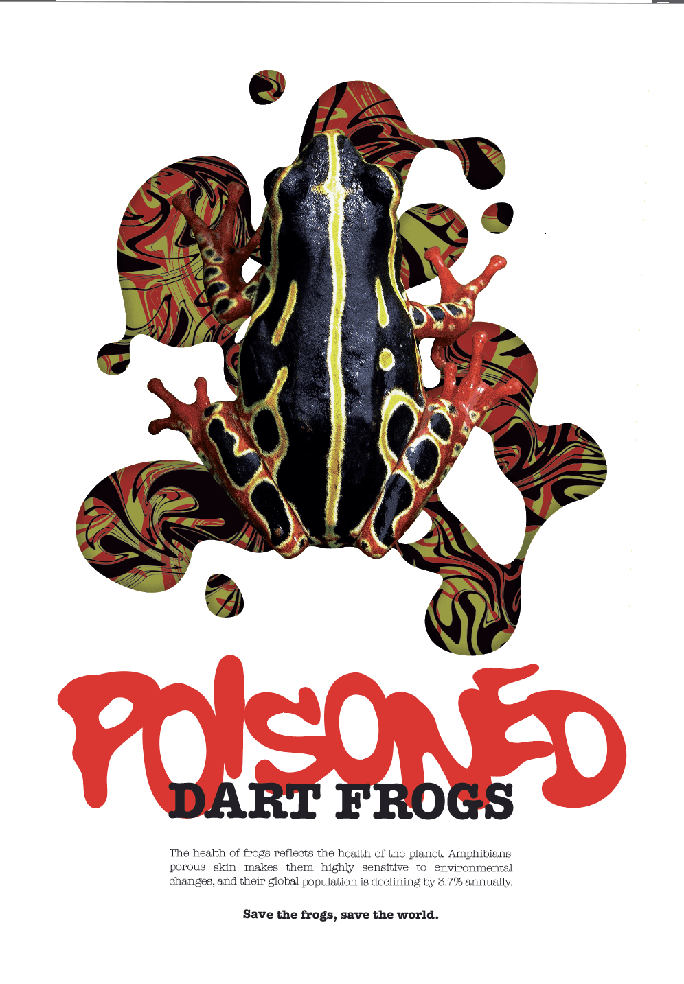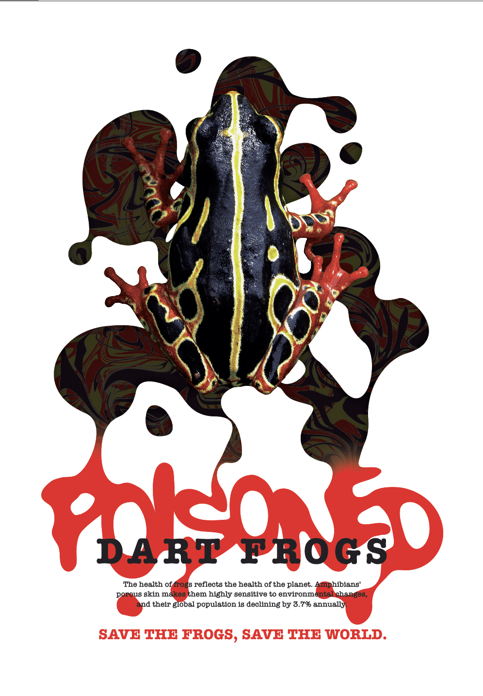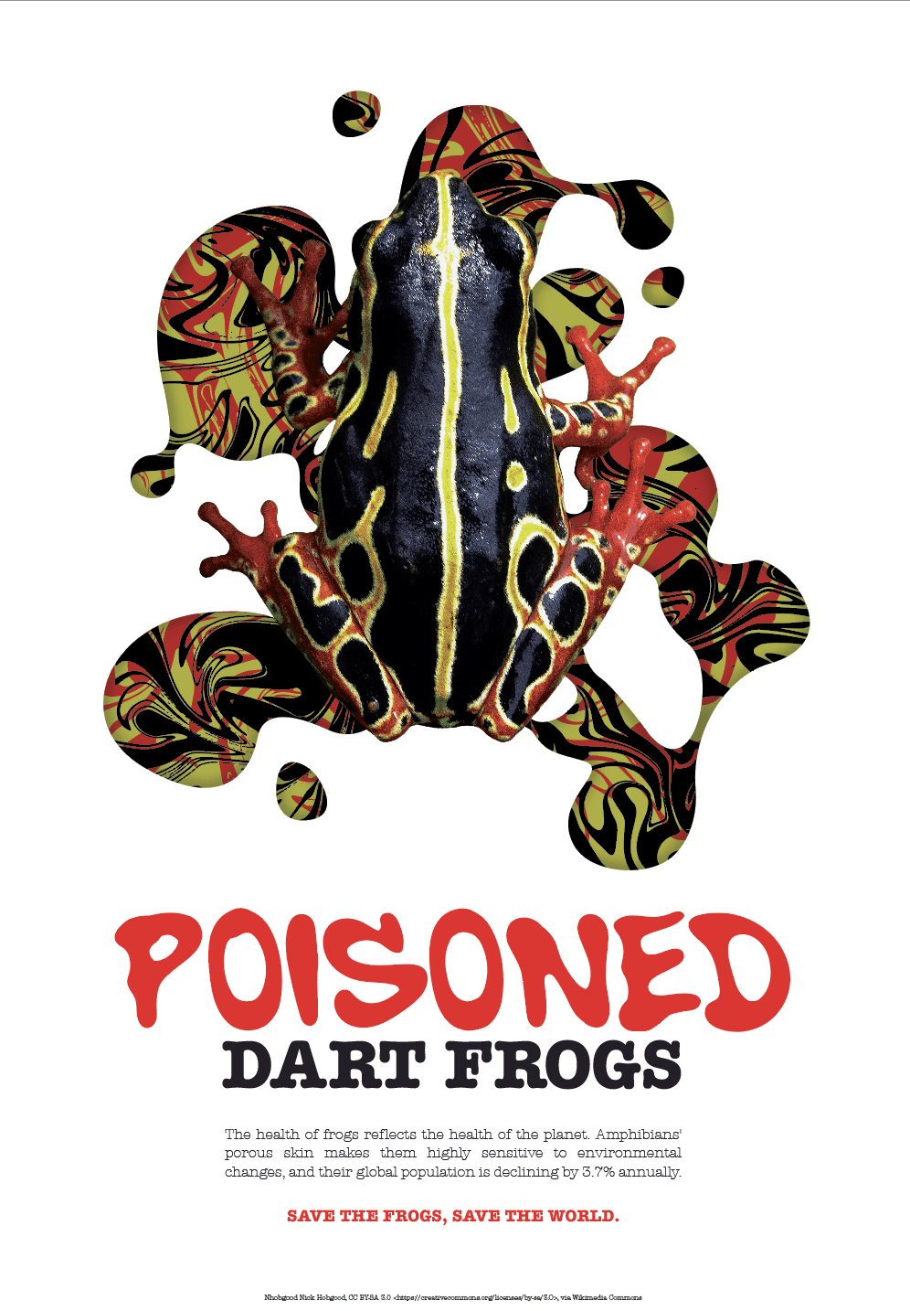 My goal was to create a poster drawing attention to climate concerns based on the way sensitive amphibians are early indicators to harmful changes in an ecosystem. I sketched many ideas, but once I found this image, I was able to establish a clear direction for the design. The oil-spill-like pattern on the frog inspired me to create a graphic that looks just as unnatural and toxic, and to create a composition where it looks as though the frog is absorbing this poison onto itself. I wanted the typography to reflect this swirling poisonous mess, so I experimented with using inky fonts and curving the baseline of the body text. The final poster represents the toxic environment amphibians and humans are facing as a result of climate change.