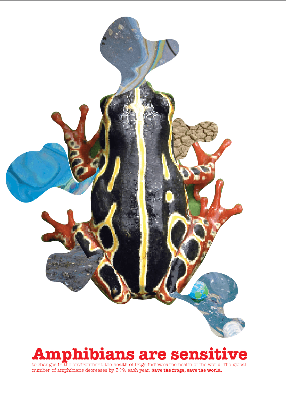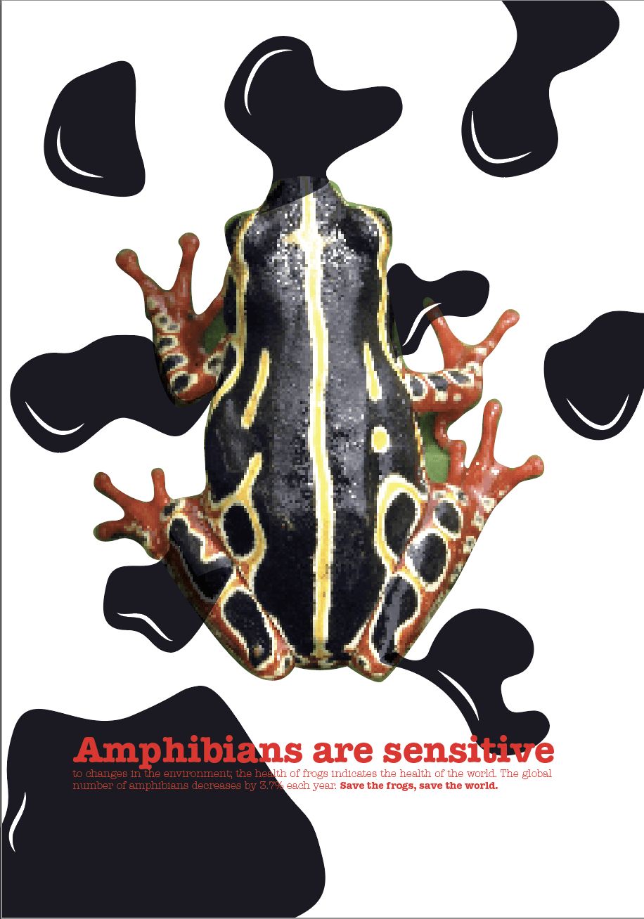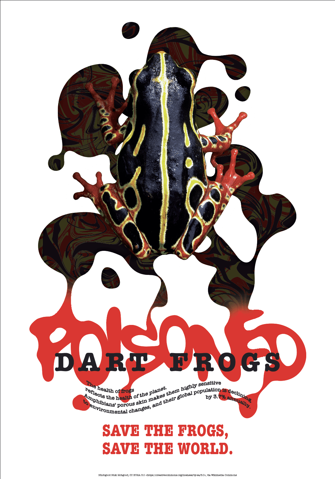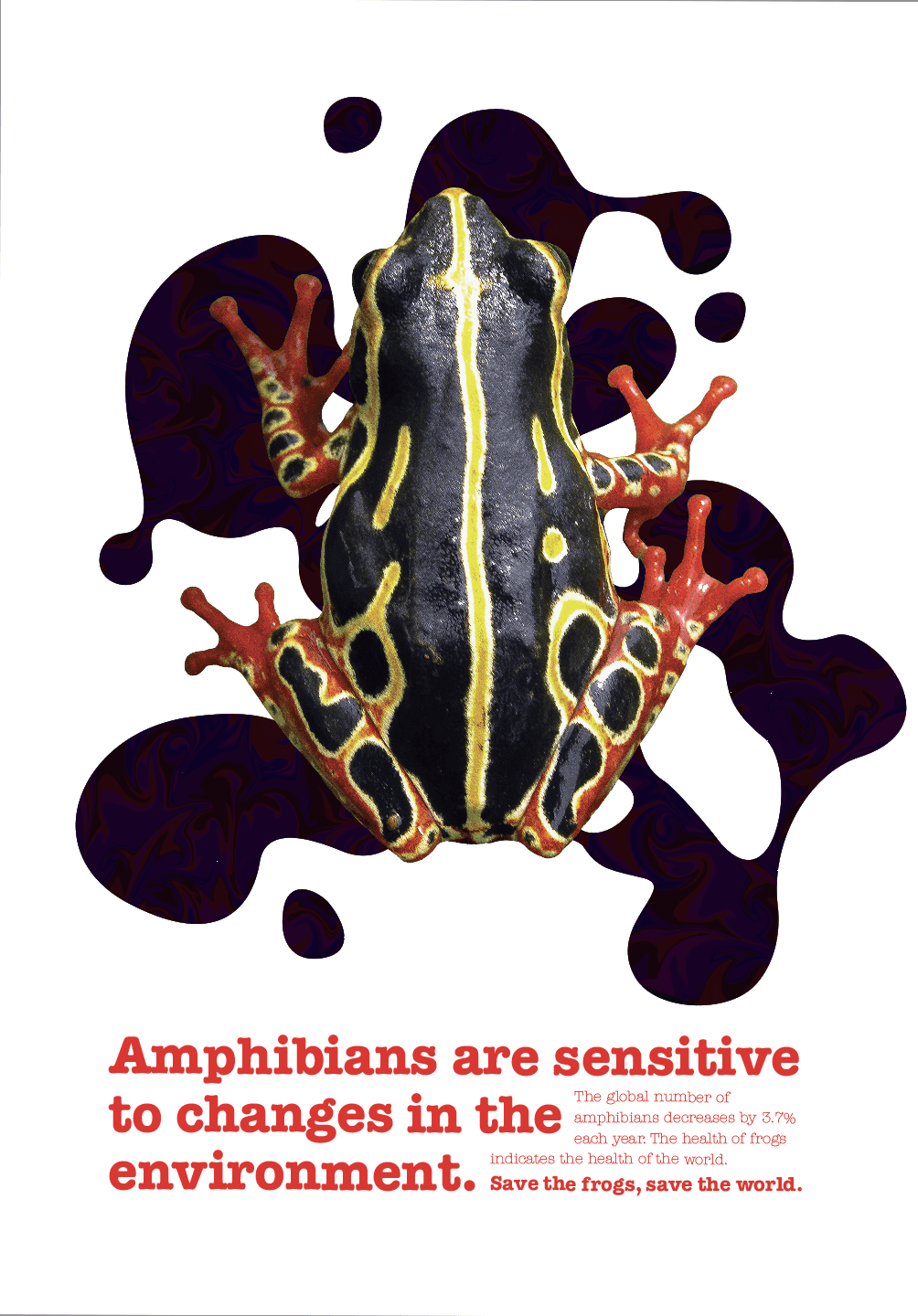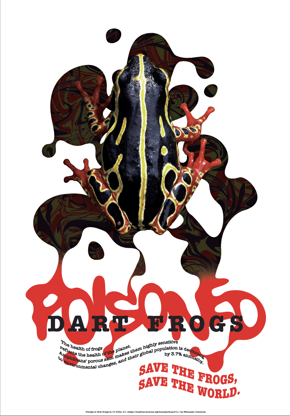 My goal was to create a poster drawing attention to climate concerns based on the way sensitive amphibians are early indicators to harmful changes in an ecosystem. I sketched many ideas, but once I found this image, I was able to establish a clear direction for the design. The oil-spill-like pattern on the frog inspired me to create a graphic that looks just as unnatural and toxic, and to create a composition where it looks as though the frog is absorbing this poison onto itself. I wanted the typography to reflect this swirling poisonous mess, so I experimented with using inky fonts and curving the baseline of the body text. The final poster represents the toxic environment amphibians and humans are facing as a result of climate change.