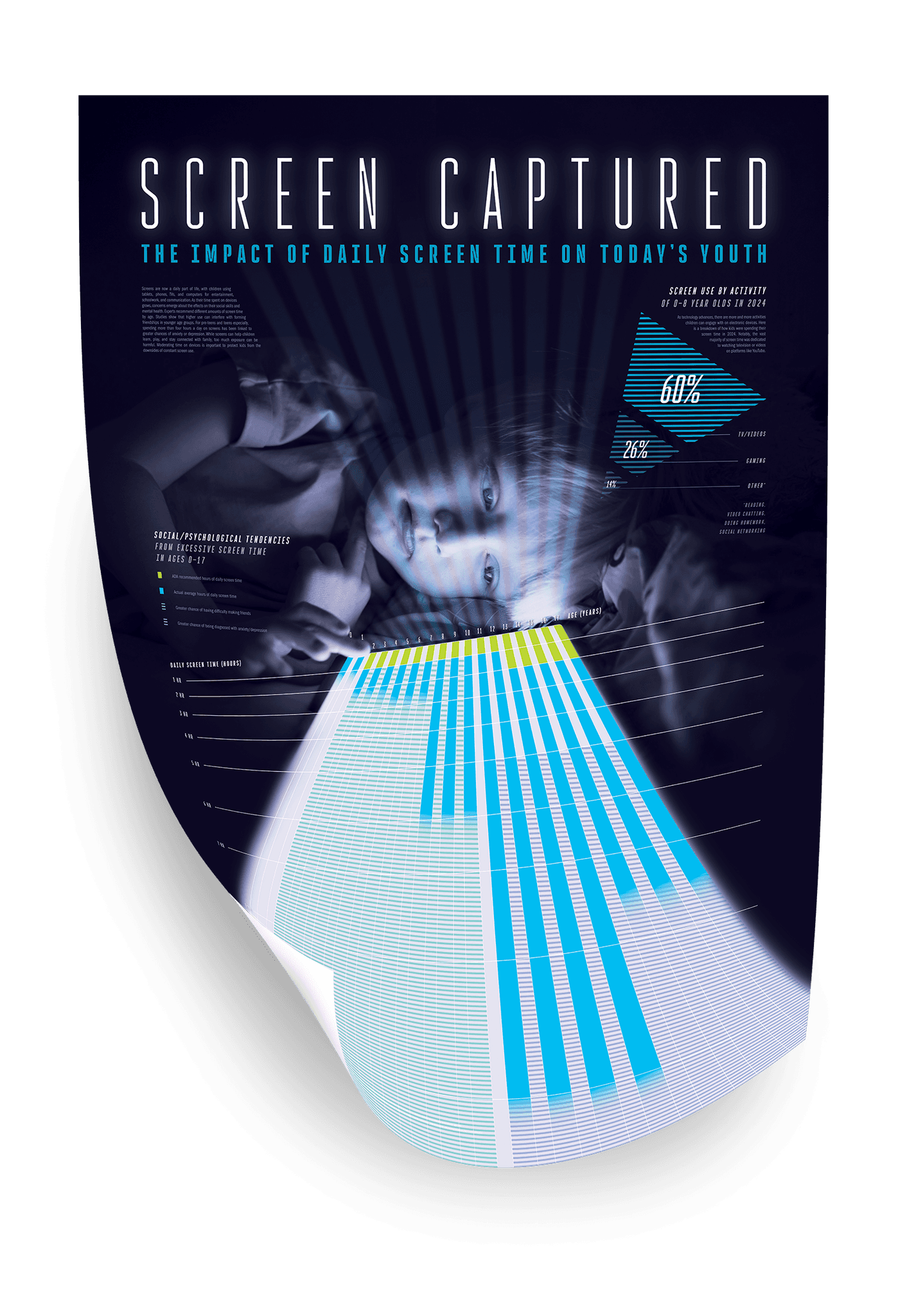 Information design poster displaying data about the impact of average daily screen time on ages 0-17.