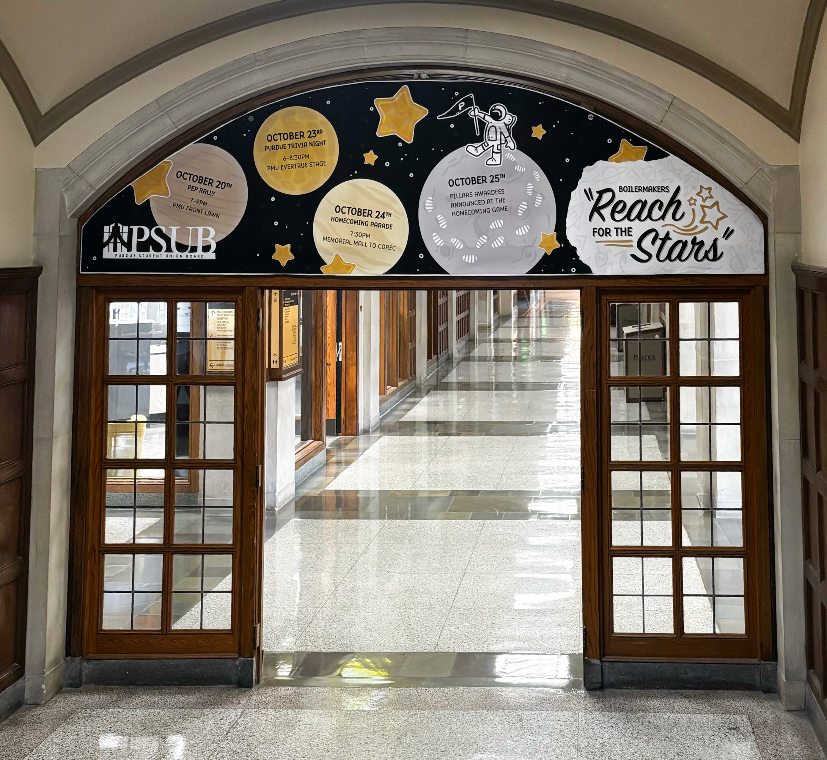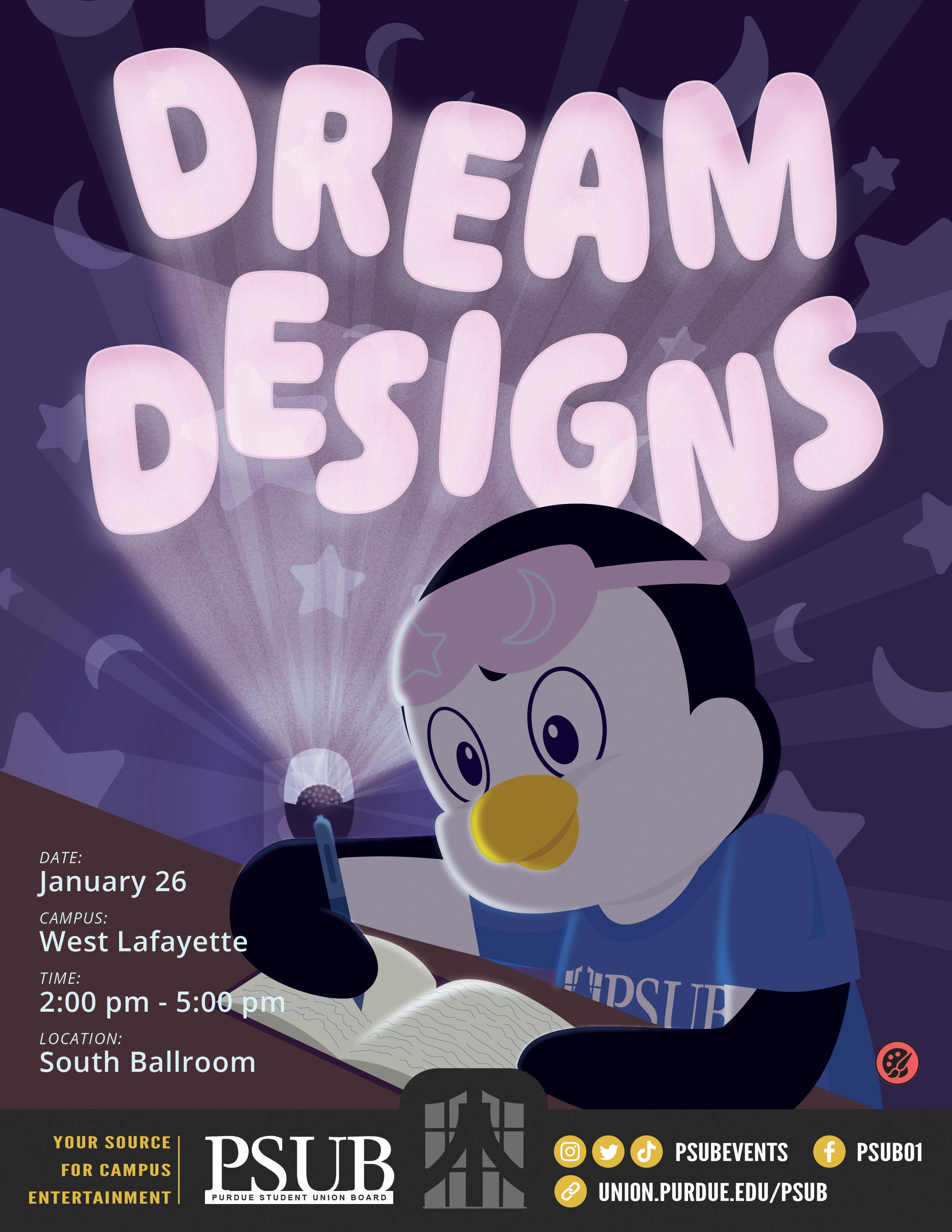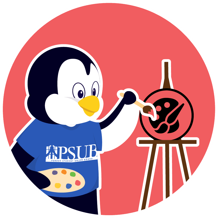Beyond designing posters, I have completed numerous other types of projects for the Purdue Student Union Board. For some events, a large crescent-shaped sign is produced and hung up in the entryway of the Purdue Memorial Union, as seen in the first image. Other assorted projects I have completed include invitations and certificates for the annual Recognition Dinner event, themed coloring pages for various events, and redesigning the organization's mascot, Percy the Penguin.