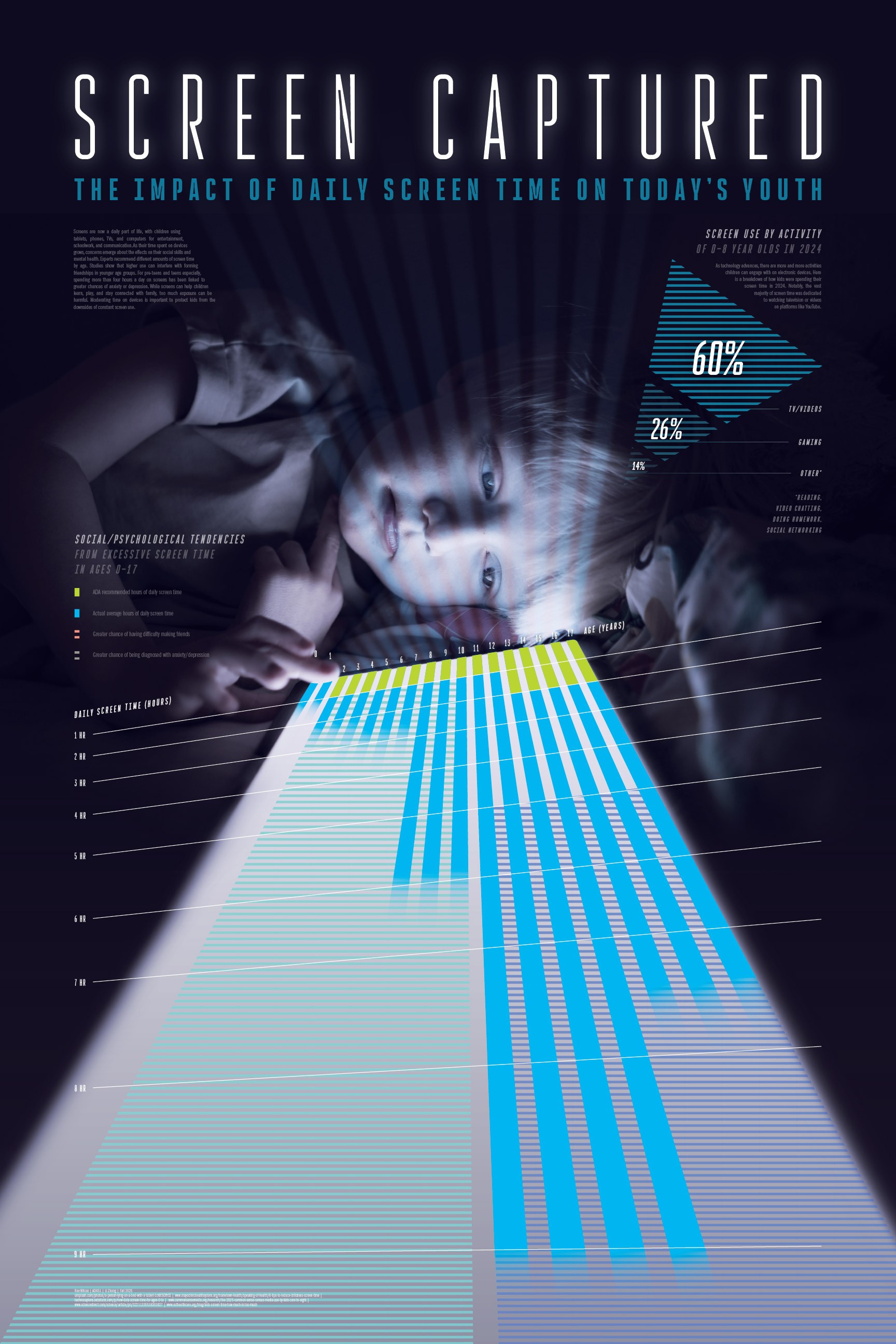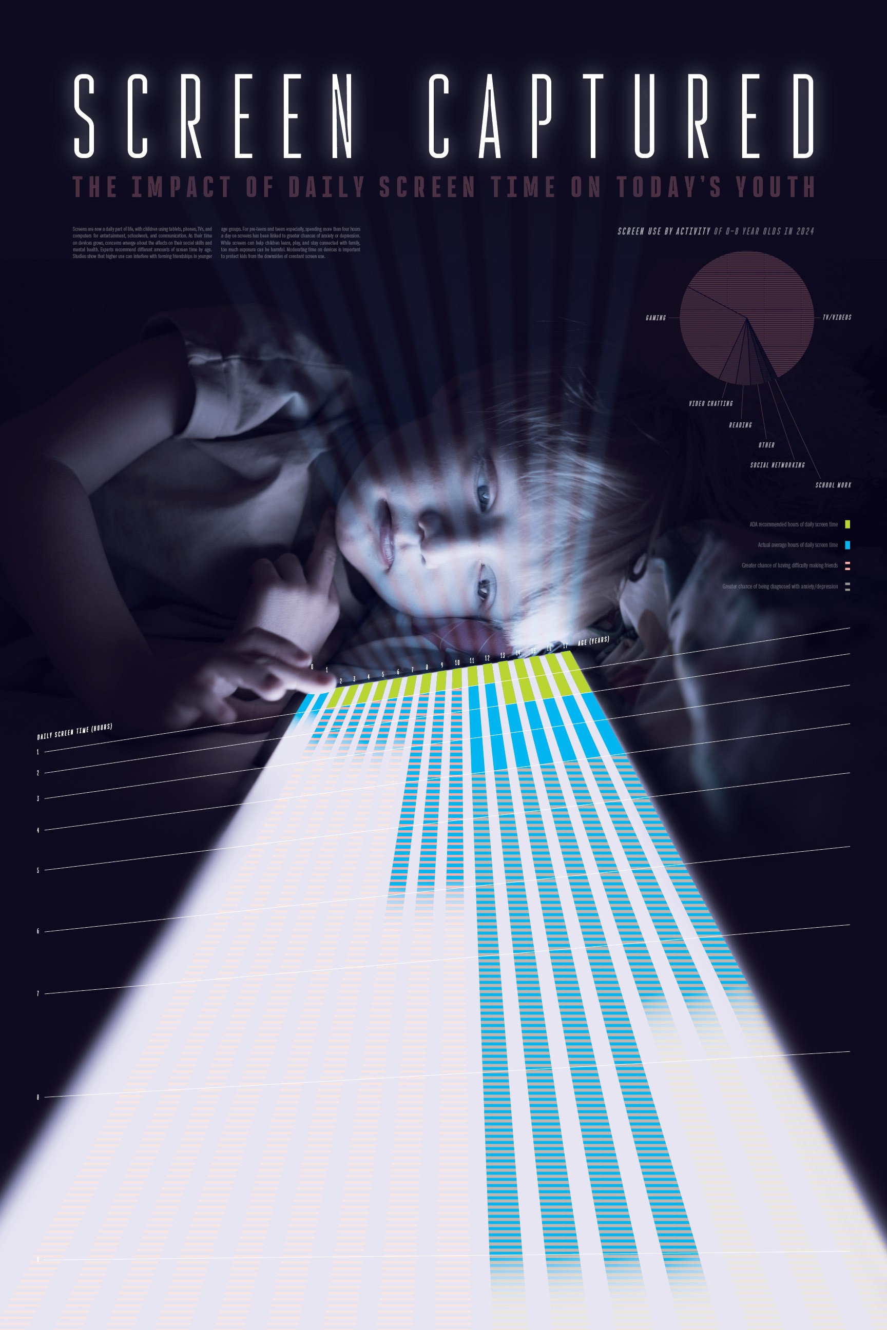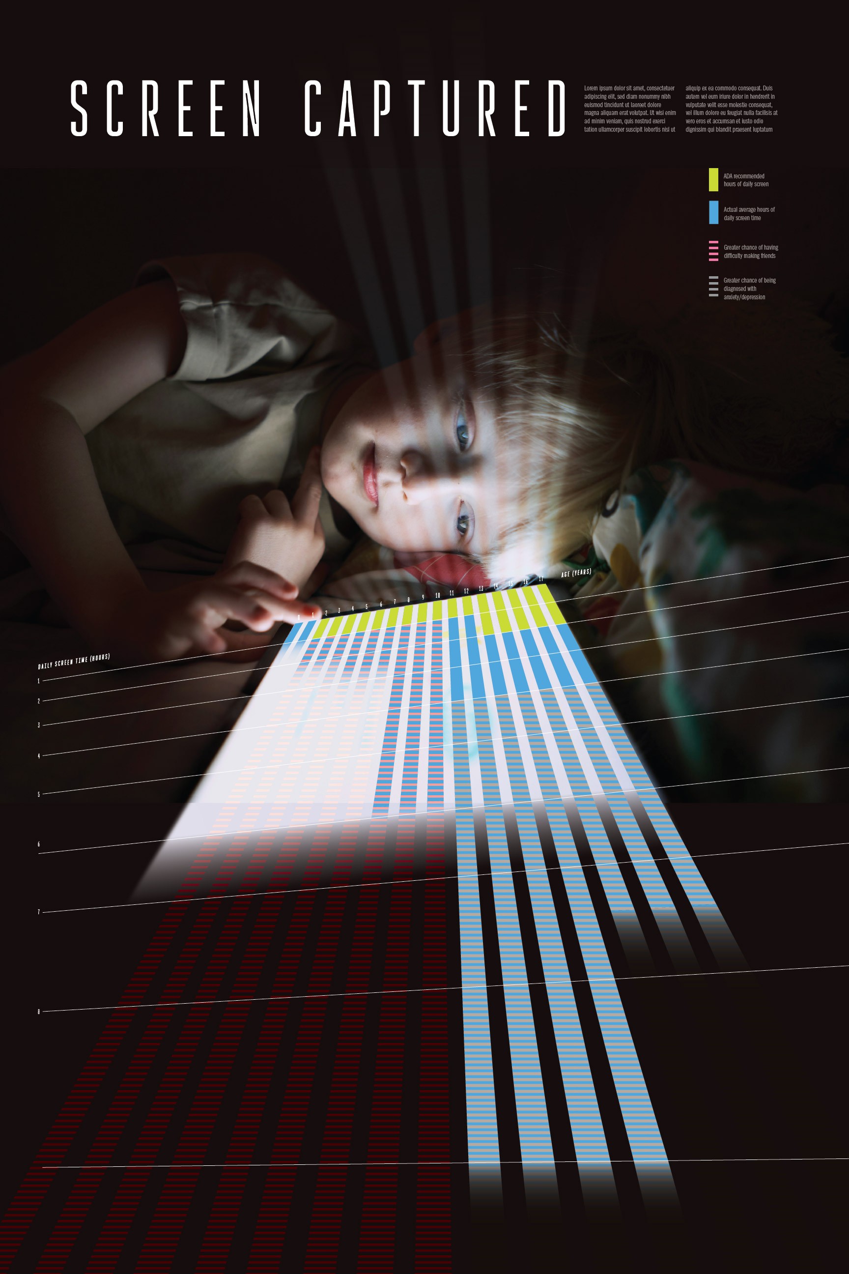 Tasked with creating an innovative way to portray data visually, I wanted to make sure the topic of my data was instantly recognizable and impactful. I sketched different layouts with intention of using a photograph of a child on a device as the base of my design. I received feedback from my peers and created digital sketches of some of my design ideas, and further iterated on one layout that received the most positive feedback. From there, the process involved refining the poster through experimenting with different layouts, colors, patterns, and content until I was satisfied. I titled the piece “Screen Captured” as a play on the term “screen capture,” implying the pictured child is captured by the screen—hence the prison-bar-like vertical beams over his face.