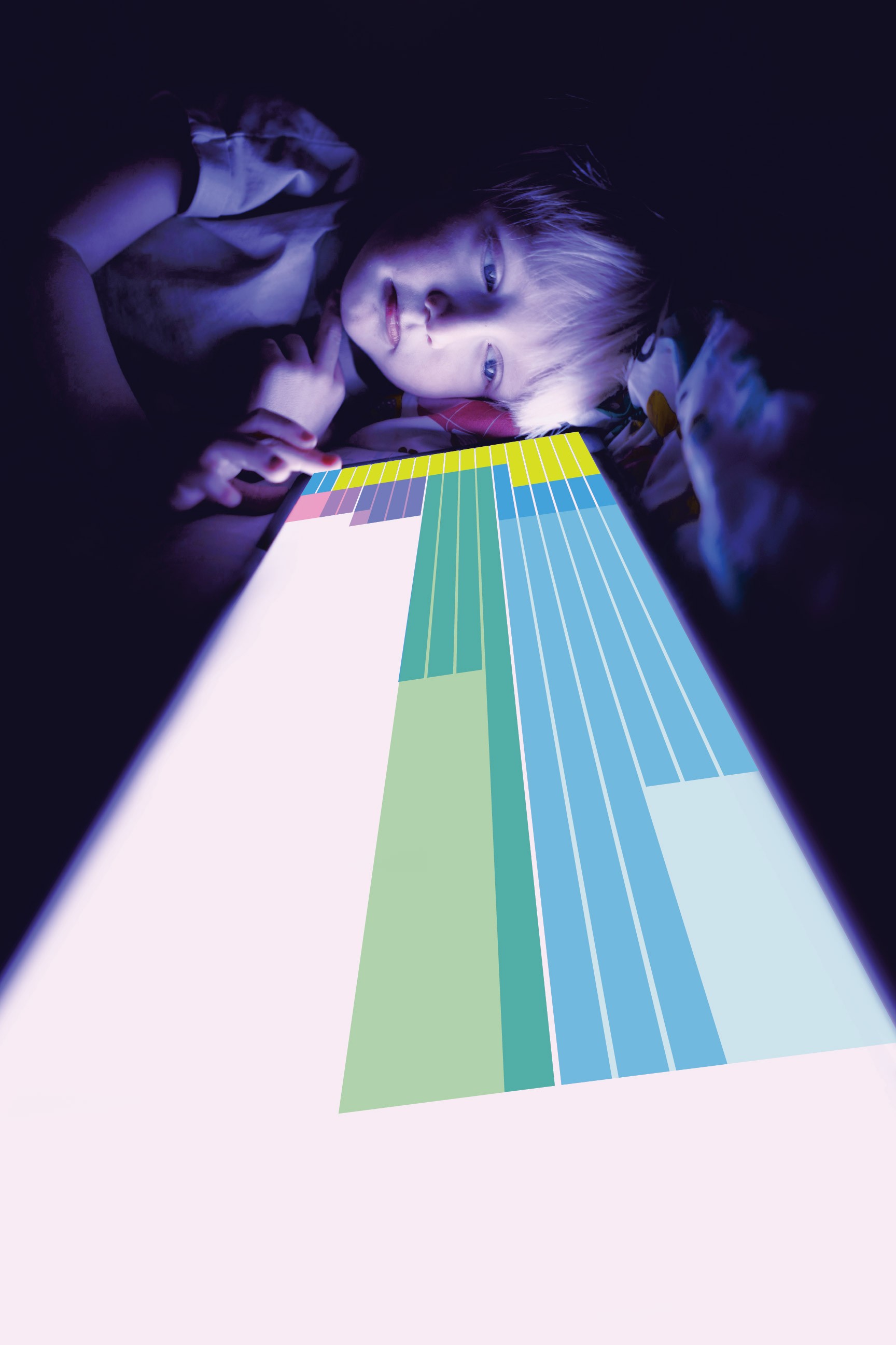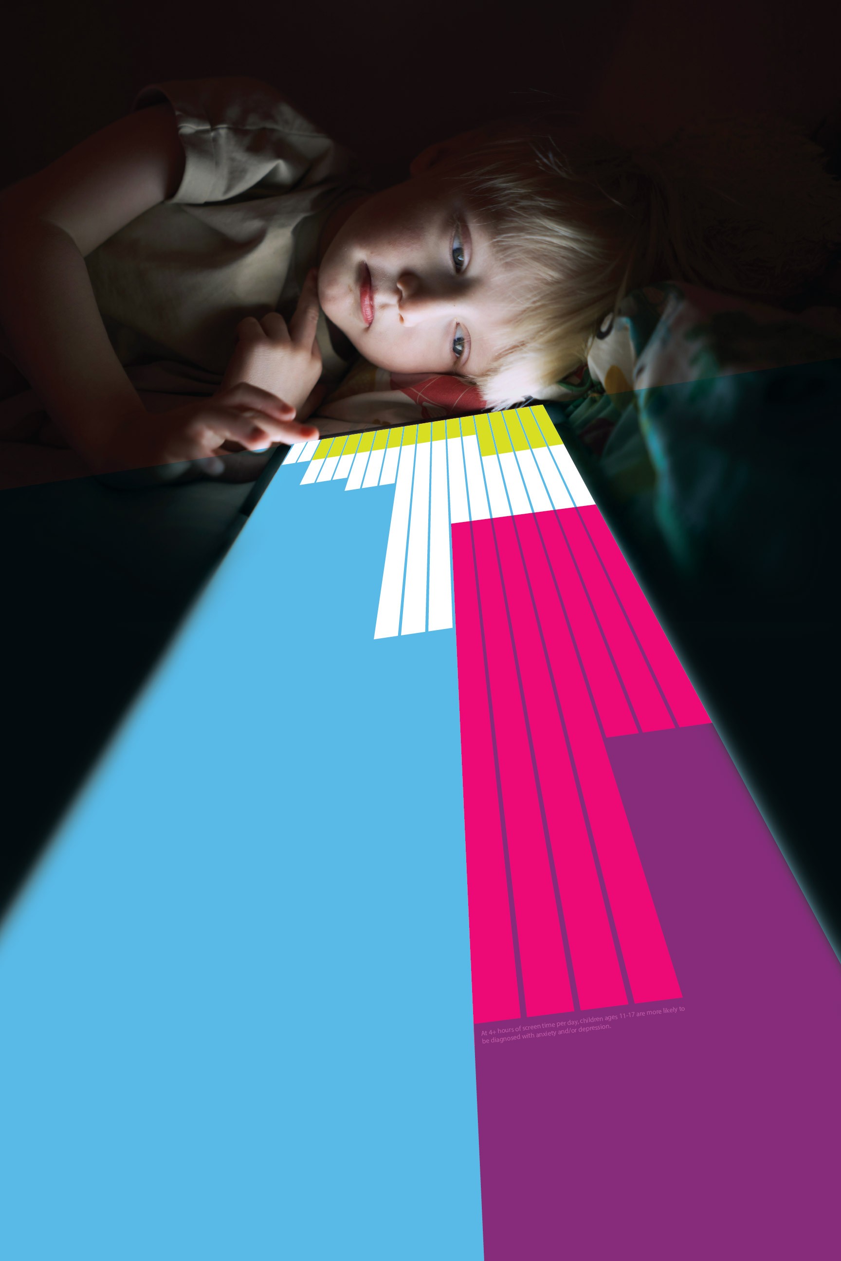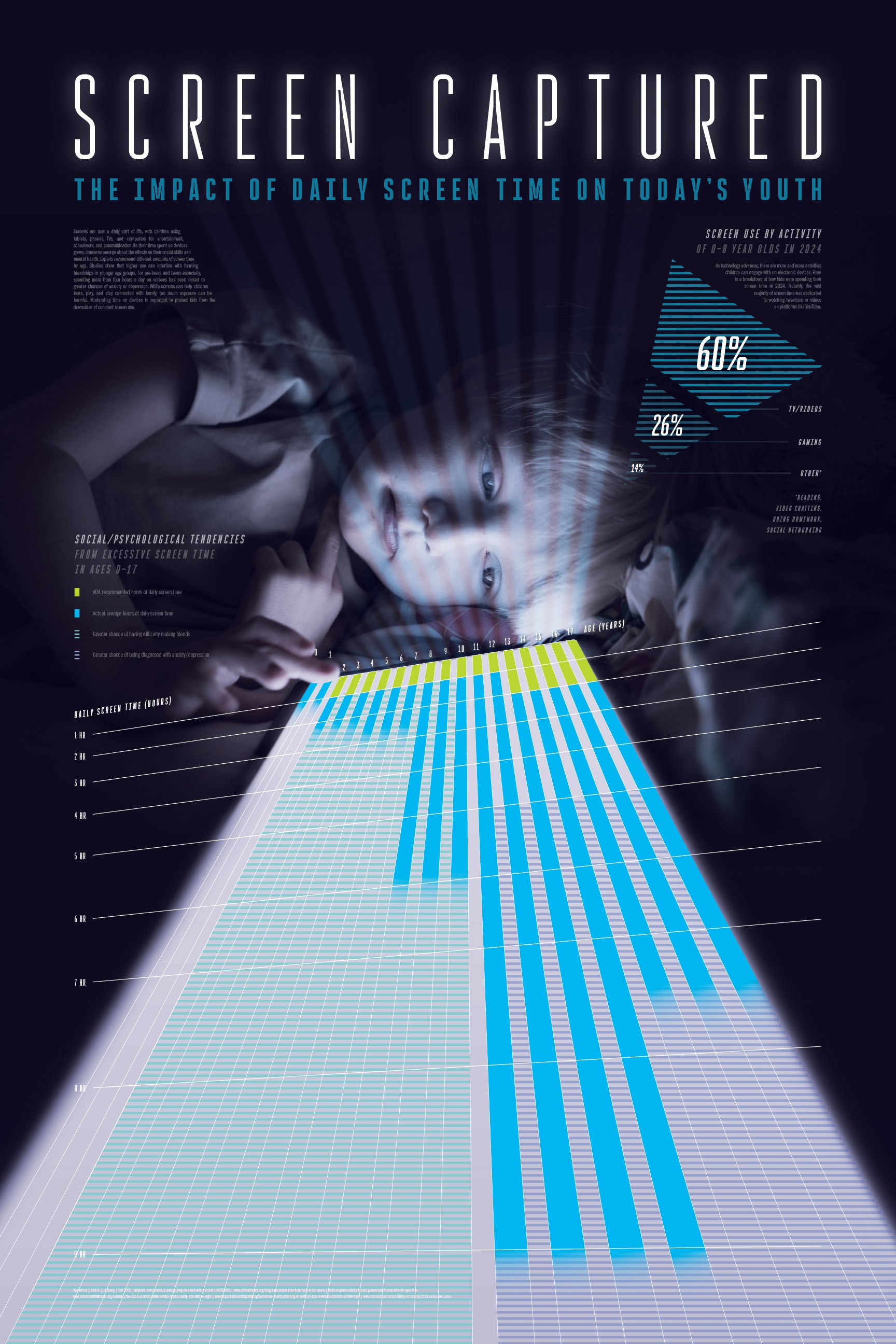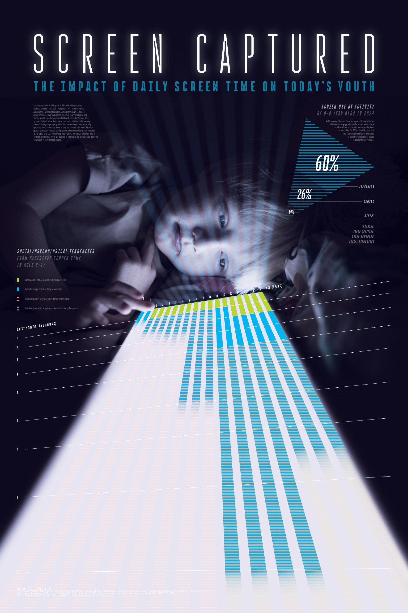 Tasked with creating an innovative way to portray data visually, I wanted to make sure the topic of my data was instantly recognizable and impactful. I sketched different layouts with intention of using a photograph of a child on a device as the base of my design. I received feedback from my peers and created digital sketches of some of my design ideas, and further iterated on one layout that received the most positive feedback. From there, the process involved refining the poster through experimenting with different layouts, colors, patterns, and content until I was satisfied. I titled the piece “Screen Captured” as a play on the term “screen capture,” implying the pictured child is captured by the screen—hence the prison-bar-like vertical beams over his face.