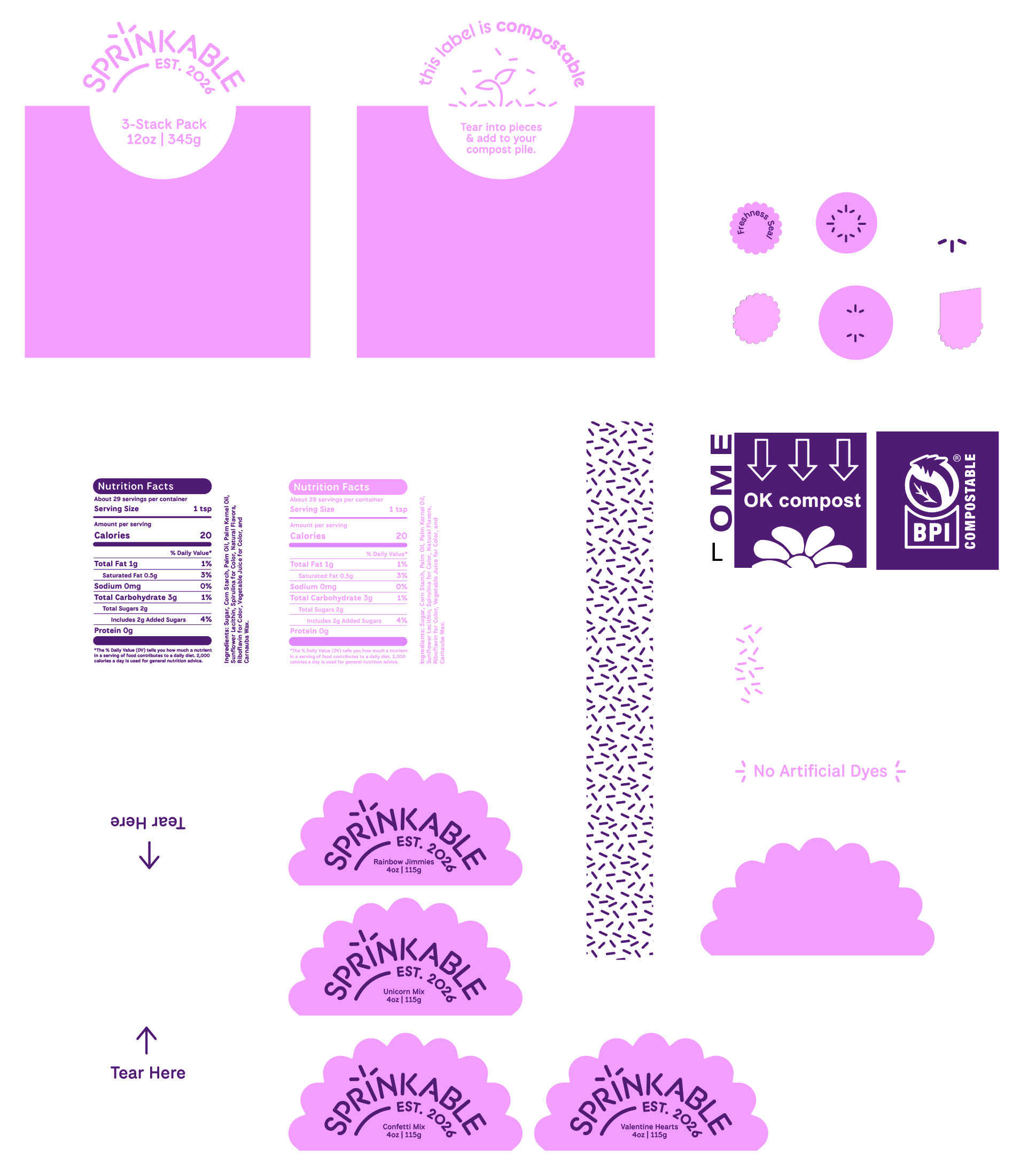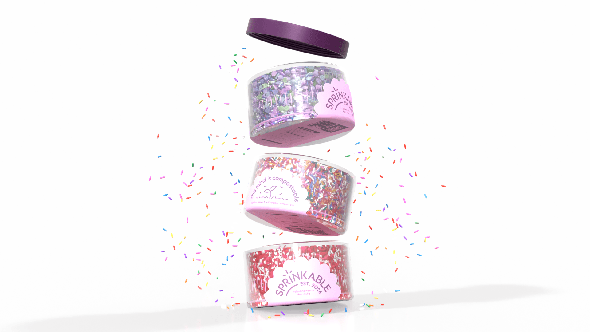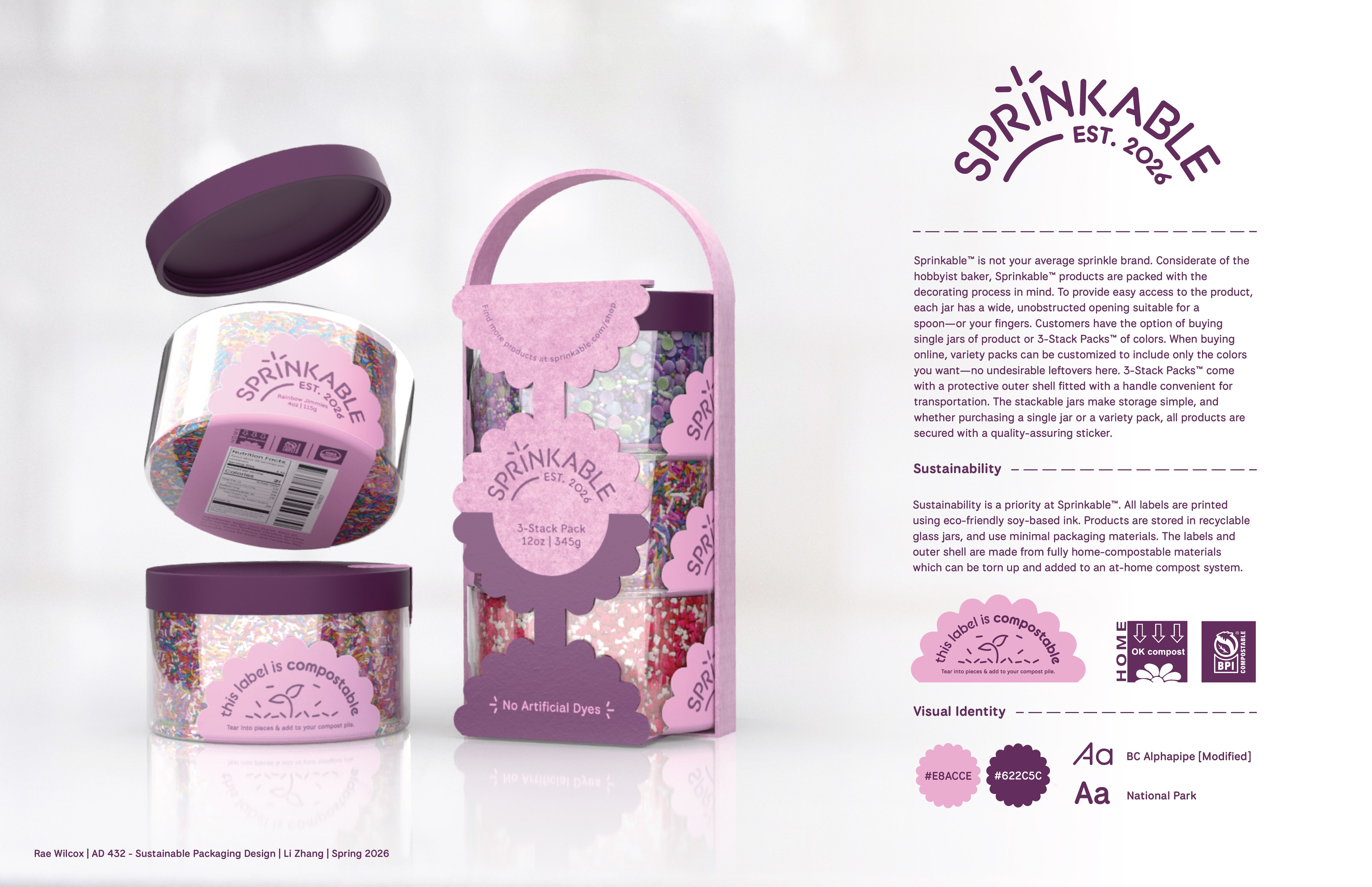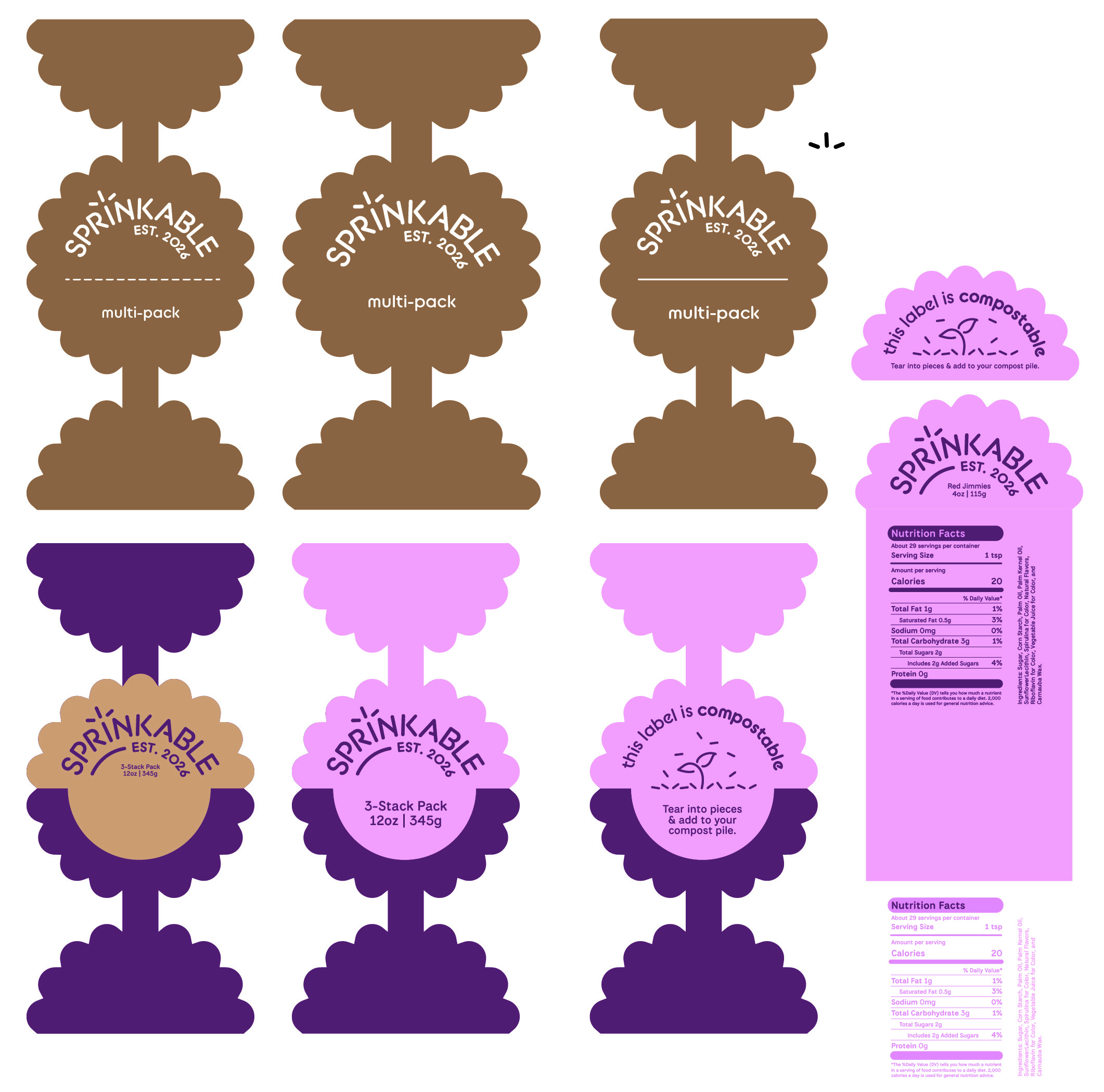 Assigned to create a brand identity and sustainable packaging design for a dry good, I chose to develop the brand Sprinkable. Since this project was focused on packaging, I started the process sketching and researching possibilities for a new way to package sprinkles that is user-friendly and sustainable. I learned from speaking with some hobbyist bakers different considerations for the design, like giving each container a wide opening so it is easy to access the product. In keeping it sustainable, I discovered the possibility of printing labels that are home compostable. I leaned into this with the product as the user would have the experience of "sprinkling" the labels into their compost after use, which I thought was a unique angle. Taking this into account, I created a digital ad showcasing this moment. I completed the project by finalizing dielines for the packaging and creating digital mockups using Adobe Dimension.