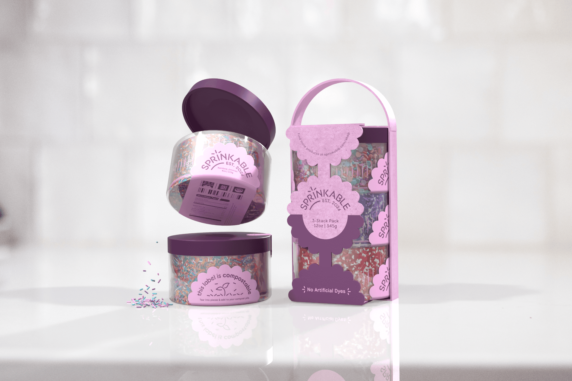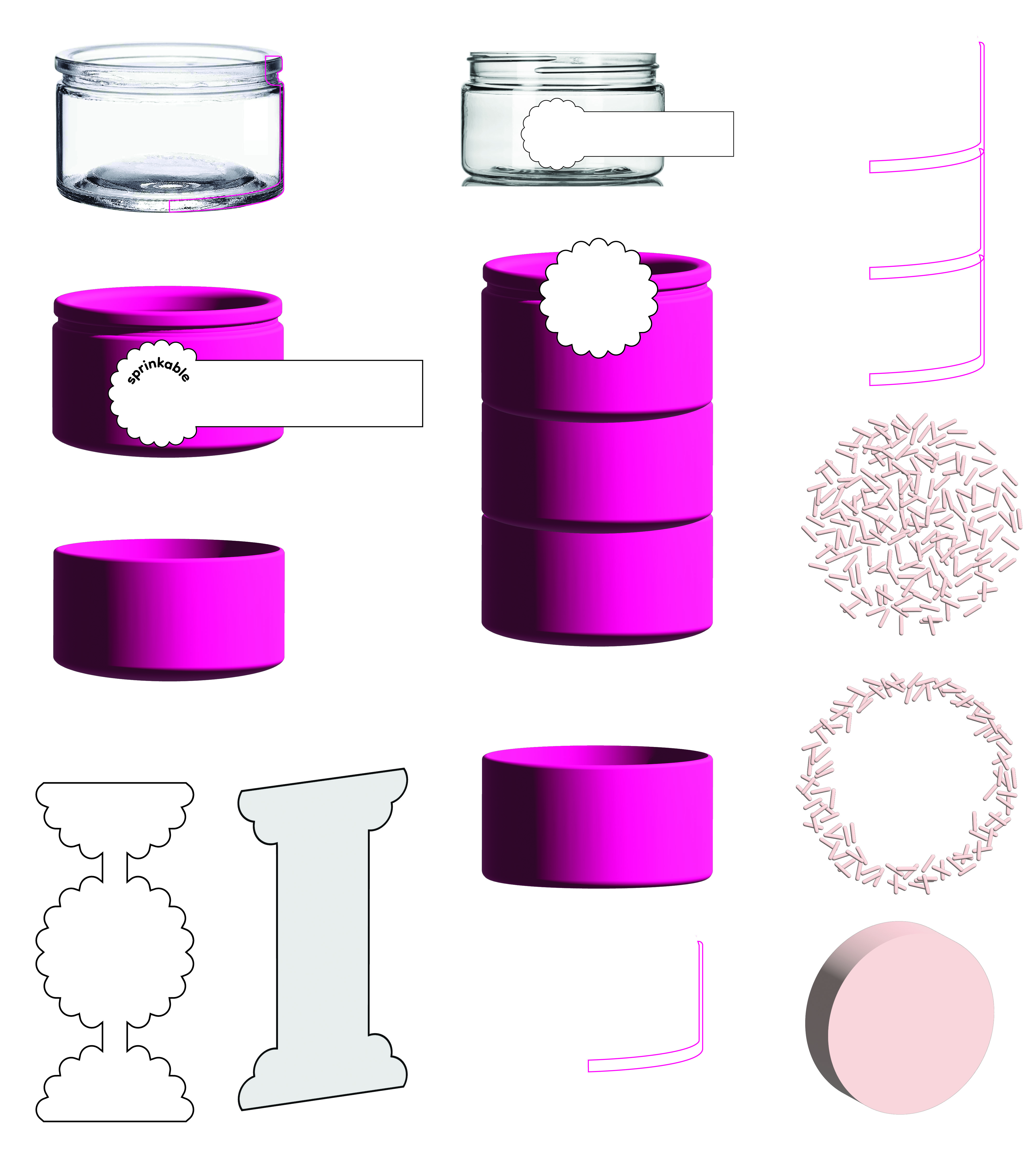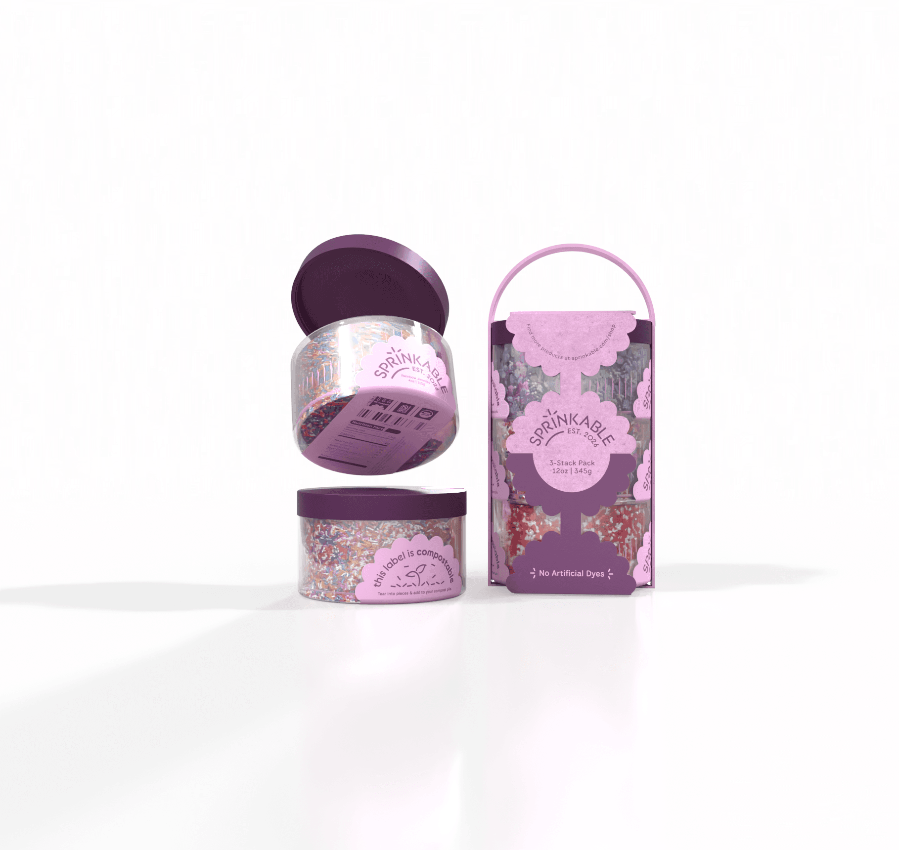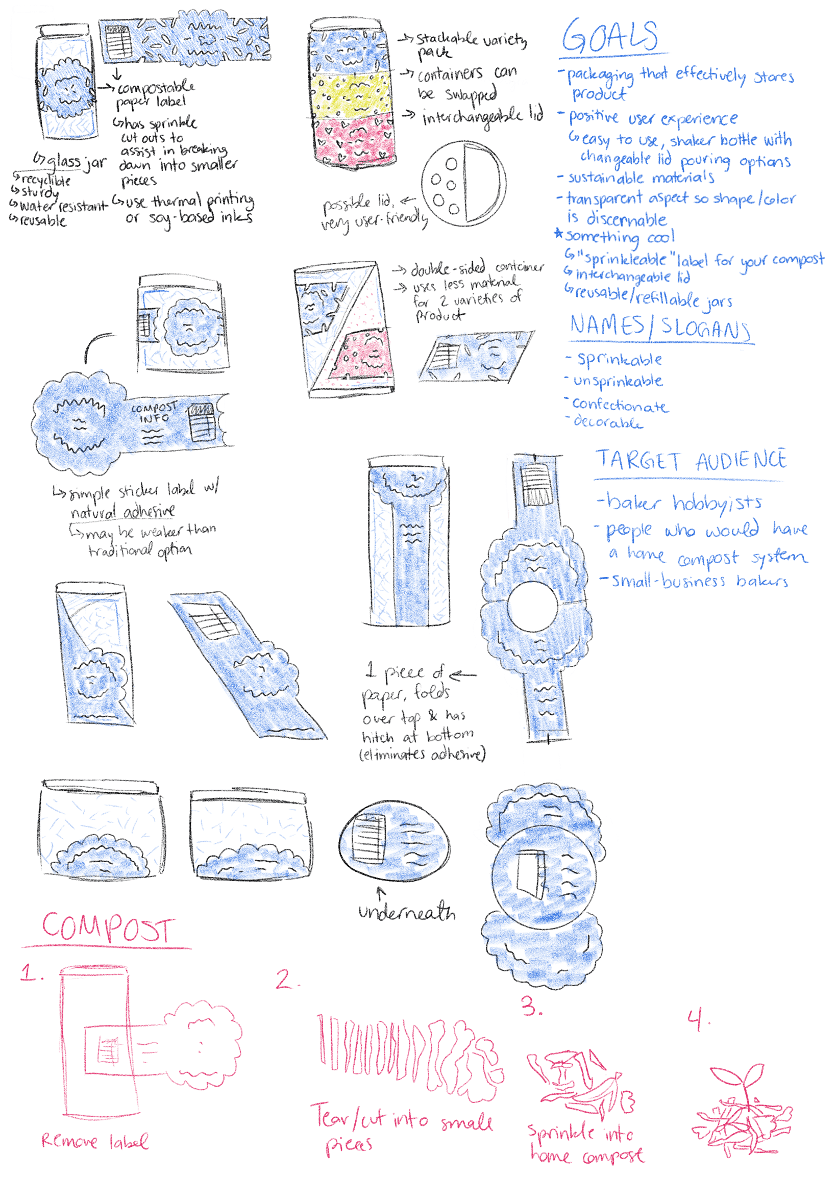 Assigned to create a brand identity and sustainable packaging design for a dry good, I chose to develop the brand Sprinkable. Since this project was focused on packaging, I started the process sketching and researching possibilities for a new way to package sprinkles that is user-friendly and sustainable. I learned from speaking with some hobbyist bakers different considerations for the design, like giving each container a wide opening so it is easy to access the product. In keeping it sustainable, I discovered the possibility of printing labels that are home compostable. I leaned into this with the product as the user would have the experience of "sprinkling" the labels into their compost after use, which I thought was a unique angle. Taking this into account, I created a digital ad showcasing this moment. I completed the project by finalizing dielines for the packaging and creating digital mockups using Adobe Dimension.