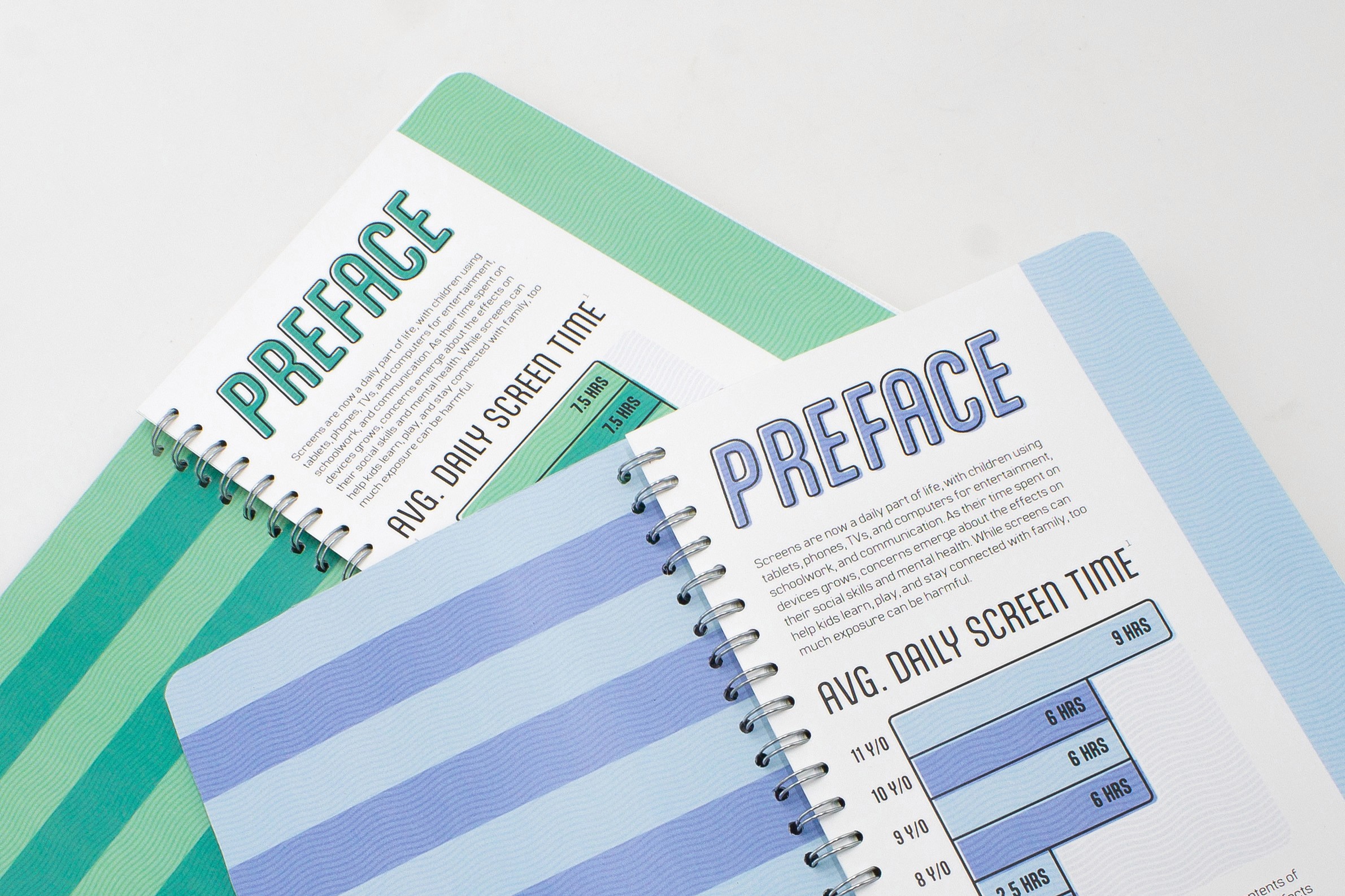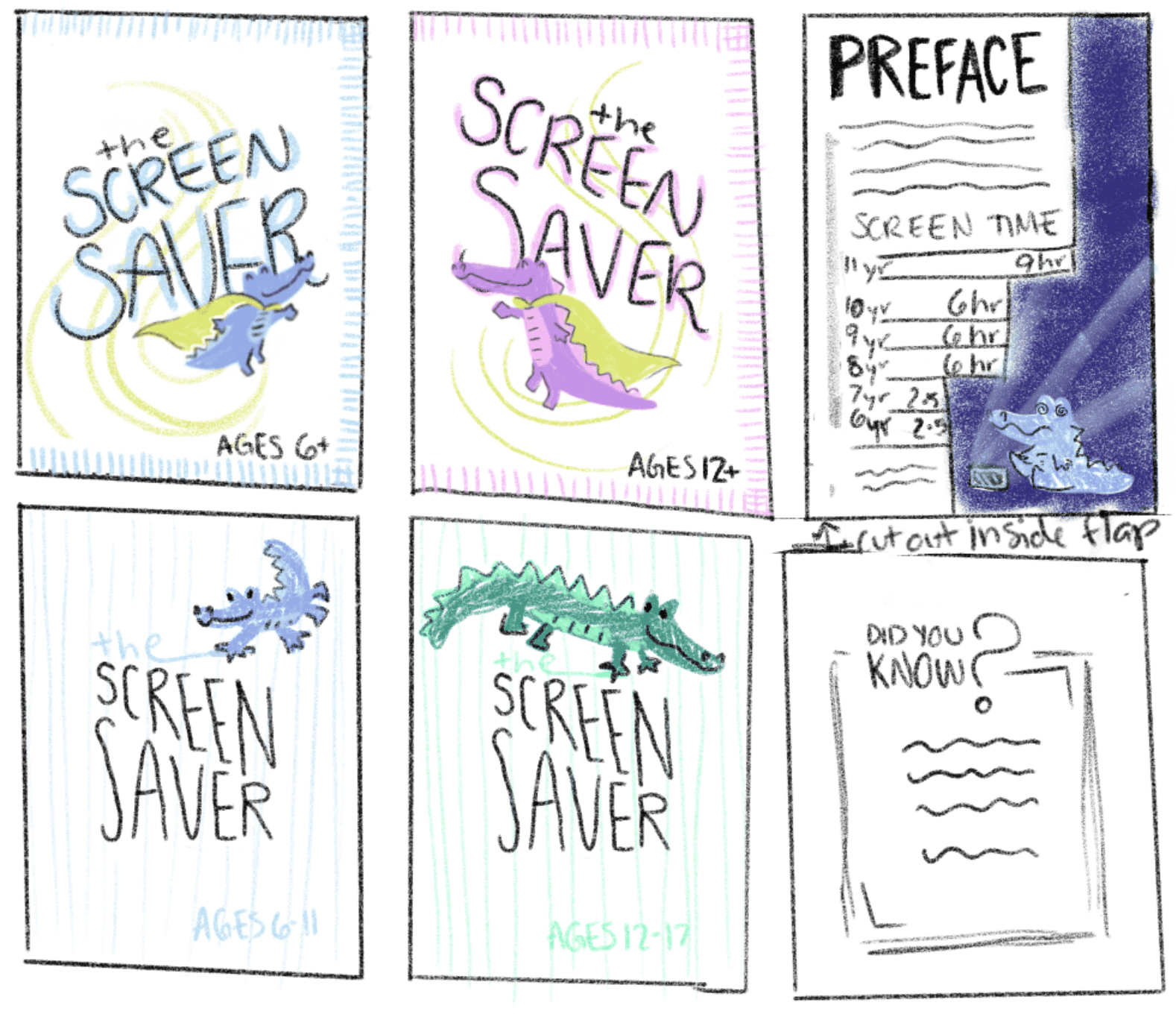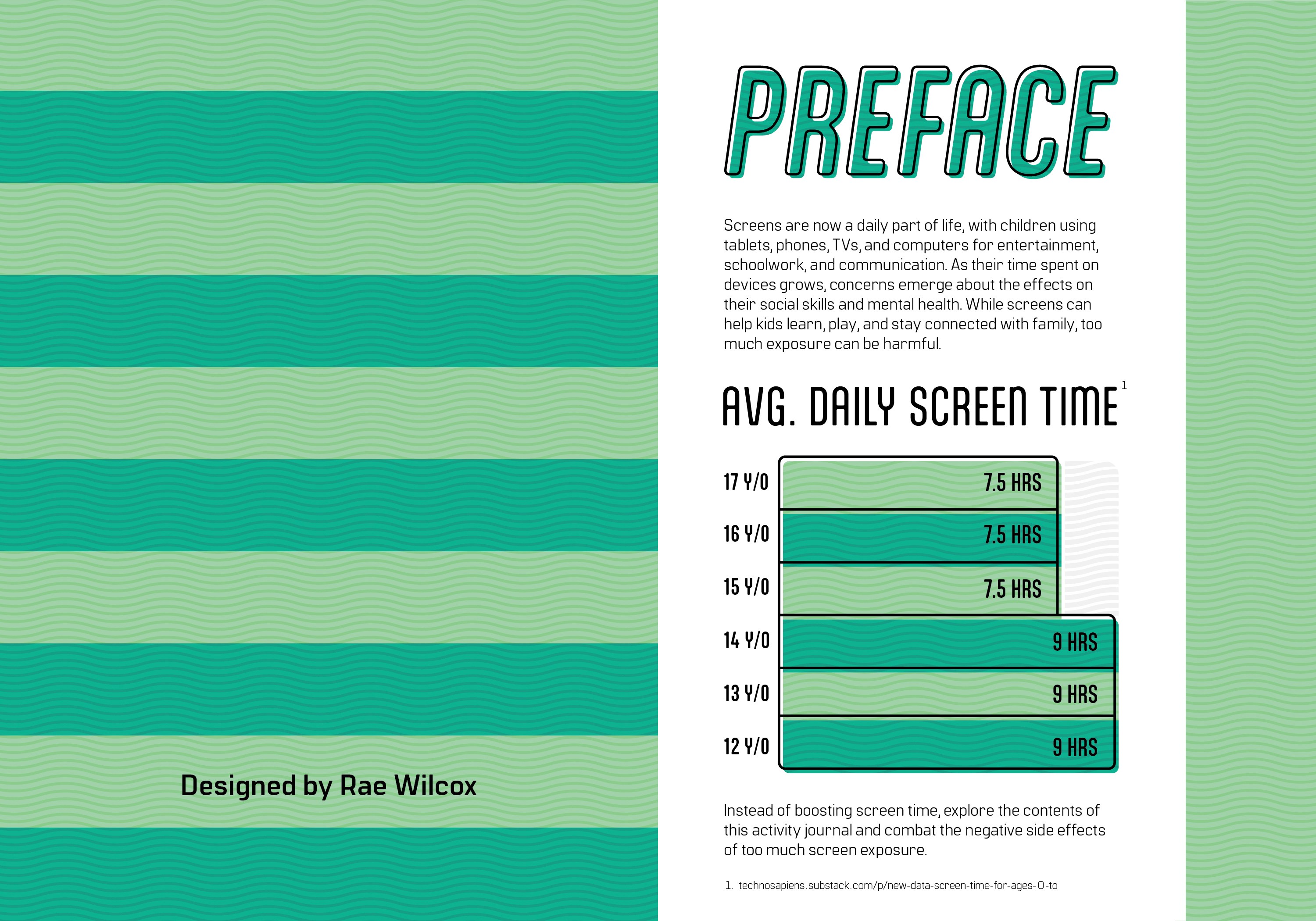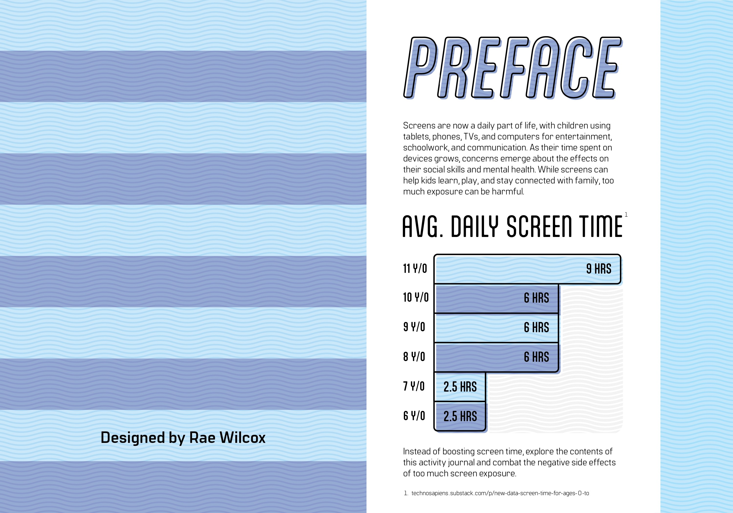 Continuing on the research from the previous project, I created an interactive piece that aims to solve some of the issues presented from excessive screen time in youth. Since the demographic addressed in my poster was quite large, I separated this project into two different versions that target different age groups so that the content is relevant and entertaining for younger and older kids. The journals include facts about screen time, puzzles, writing prompts, and coloring pages. As a nod to the previous project, I kept a similar structure for the title by using a technology term—screen saver—and giving it a double meaning, as in this book will “save” the user from screens.