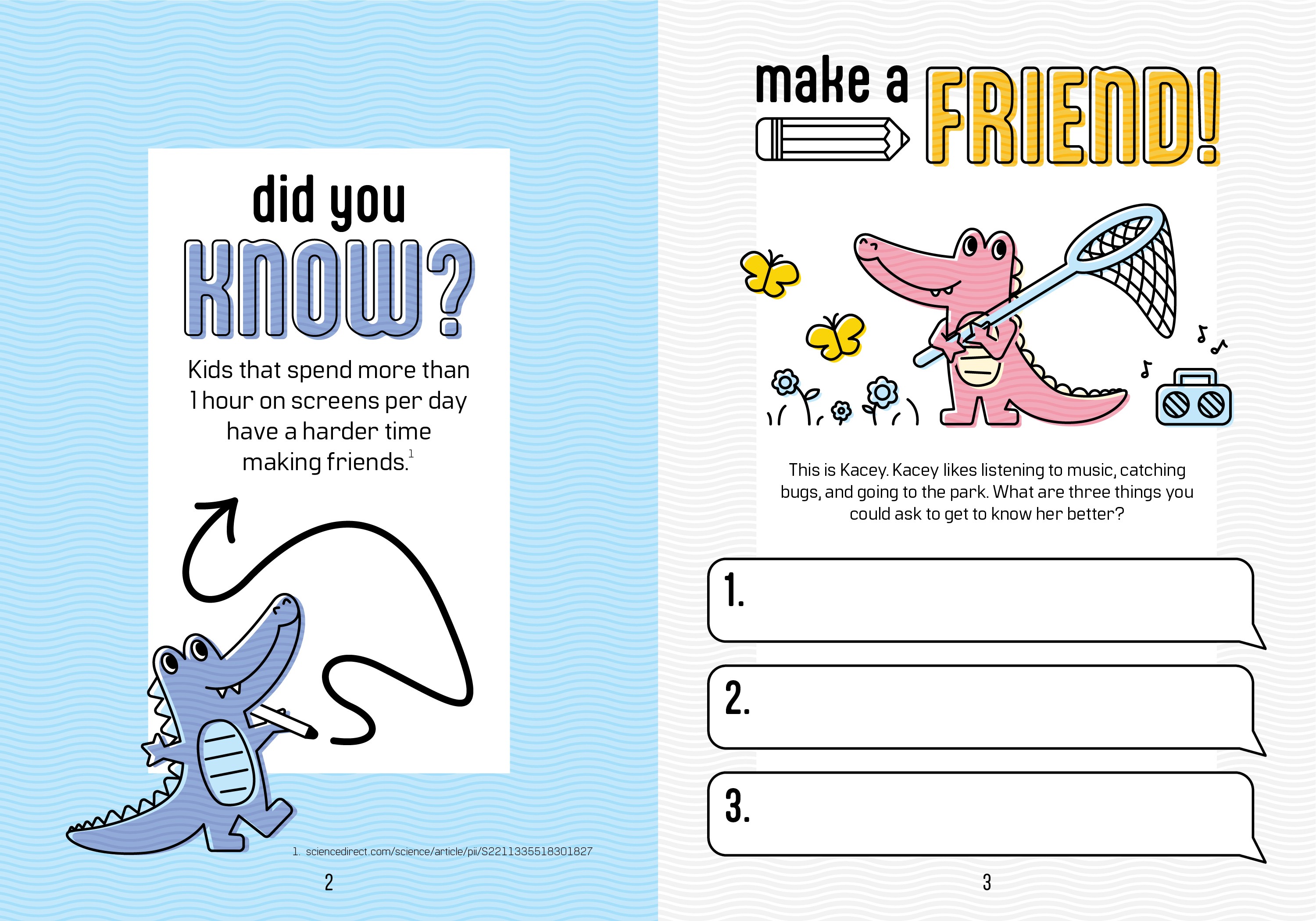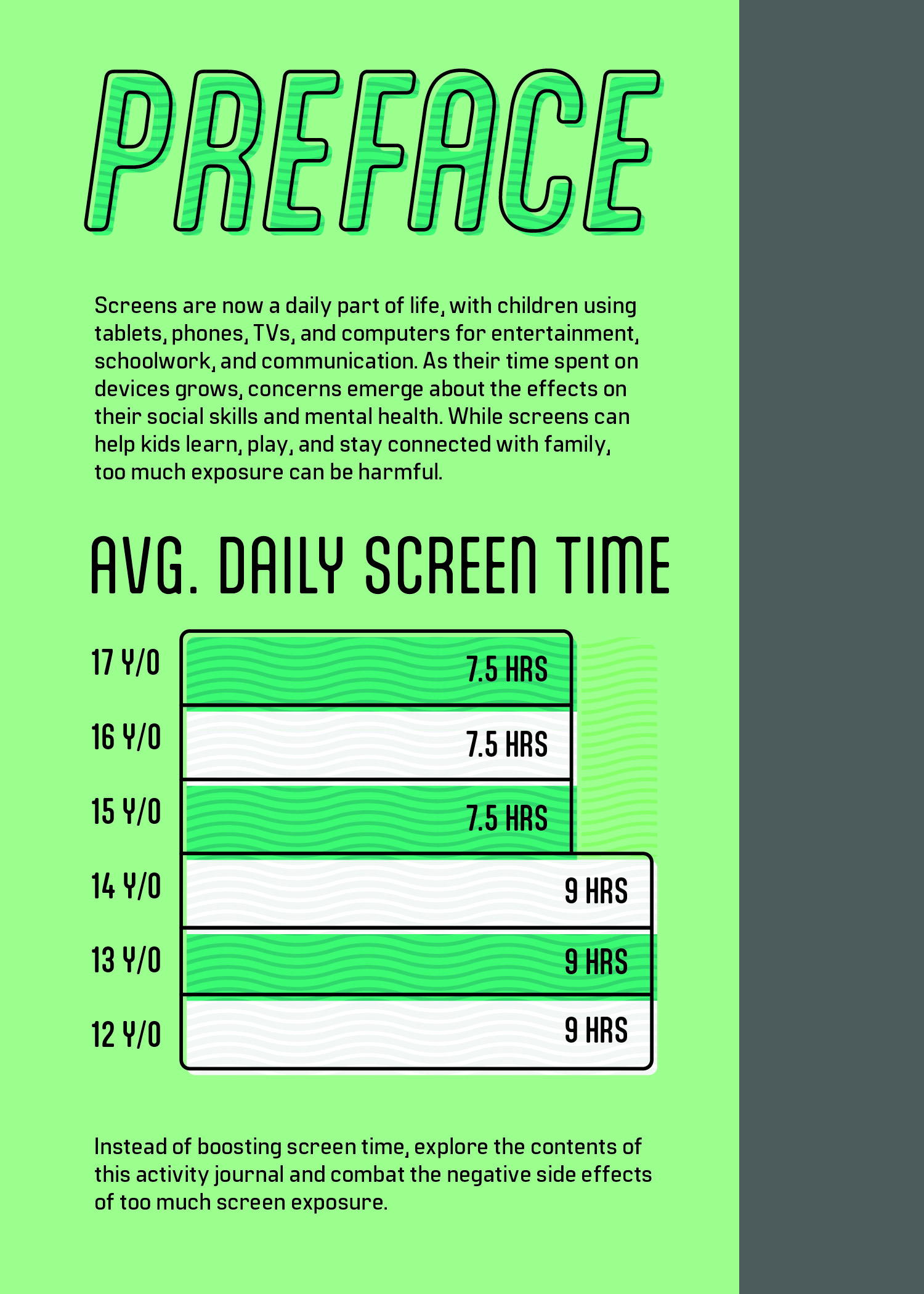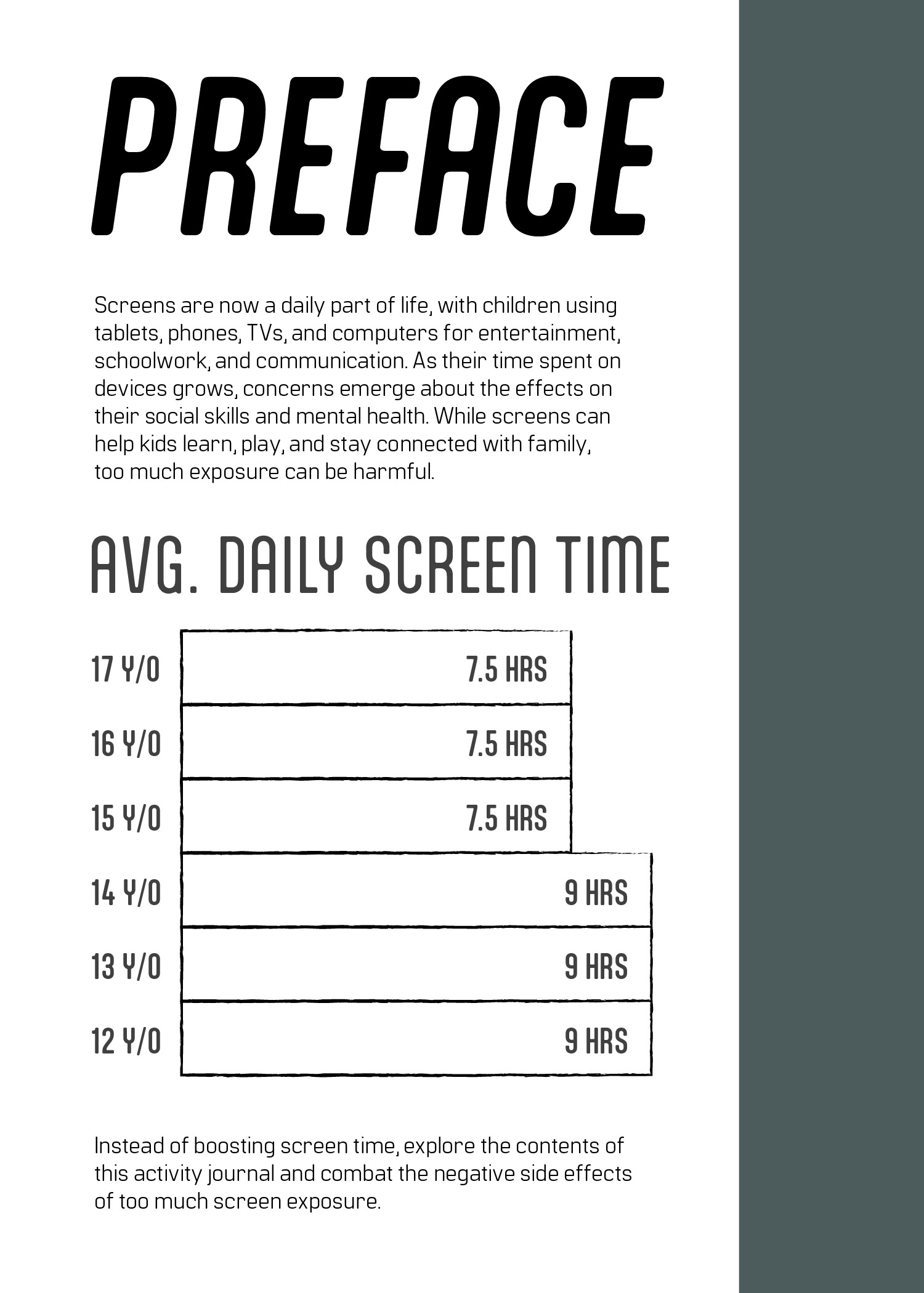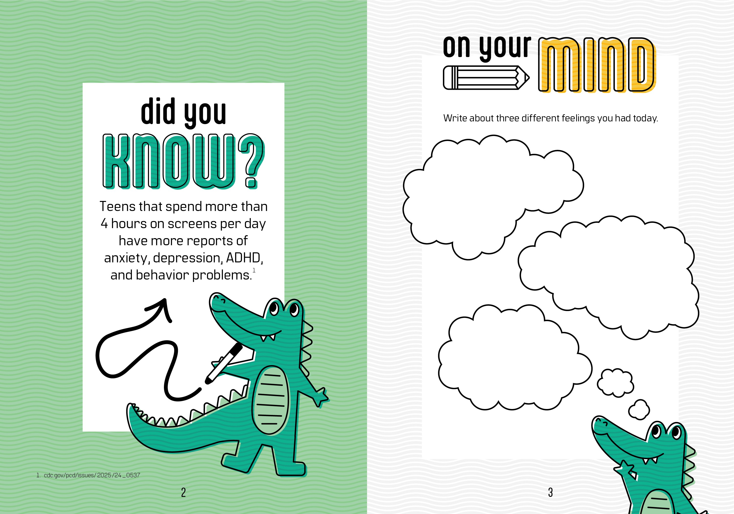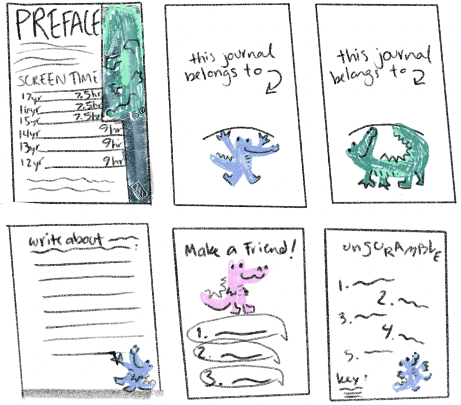 Continuing on the research from the previous project, I created an interactive piece that aims to solve some of the issues presented from excessive screen time in youth. Since the demographic addressed in my poster was quite large, I separated this project into two different versions that target different age groups so that the content is relevant and entertaining for younger and older kids. The journals include facts about screen time, puzzles, writing prompts, and coloring pages. As a nod to the previous project, I kept a similar structure for the title by using a technology term—screen saver—and giving it a double meaning, as in this book will “save” the user from screens.